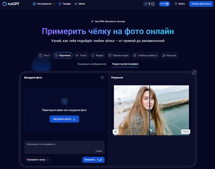 Решить эту задачу помогает платформа ruGPT.io — агрегатор нейросетей, где можно примерить чёлку по собственному описанию, изменить форму, длину, густоту и даже текстуру волос прямо на фото. Достаточно загрузить снимок и описать желаемый стиль, чтобы за несколько секунд получить реалистичный результат и увидеть, как именно будет выглядеть новая причёска без похода к парикмахеру.