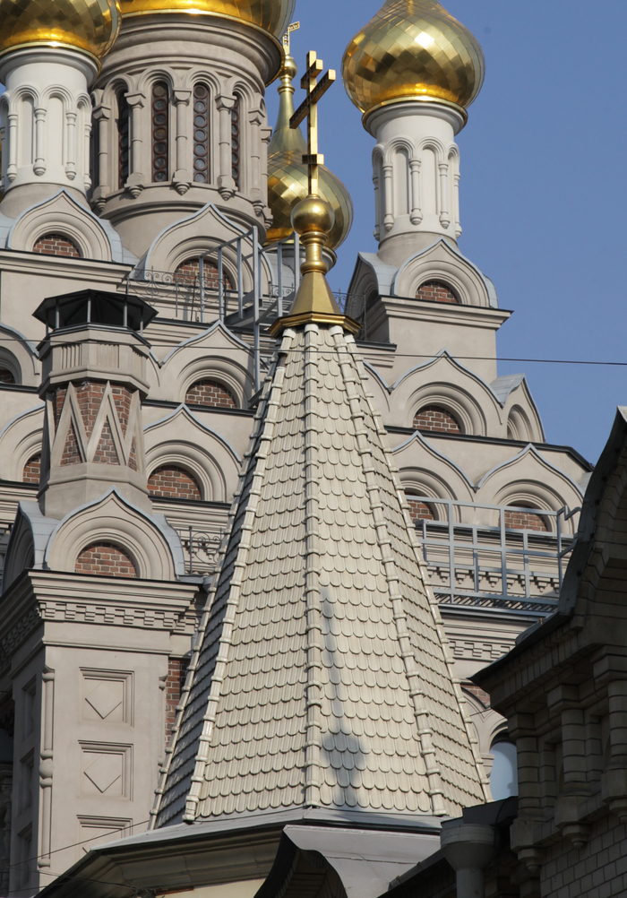 Сегодня посмотрим как должна работать архитектурная керамика на примере черепицы, которой покрыта часовня, стоящая на берегу Невы. Построена в 1996 году, а впервые я сфотографировал её в 2009-м: