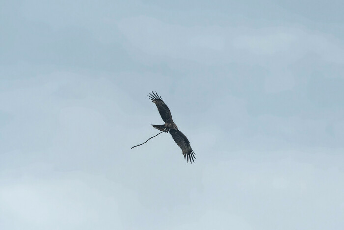Через 10 минут из-за леса вылетел коршун. И, как мне показалось, со змеёй в когтях. Ничоси, мелькнула мысль. Но в лапах птицы оказалась кривая во все стороны ветка. Эх, какой сюжет не состоялся. Спасибо хоть за то, что палка по голове не прилетела.