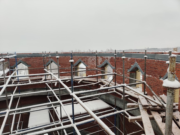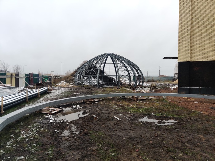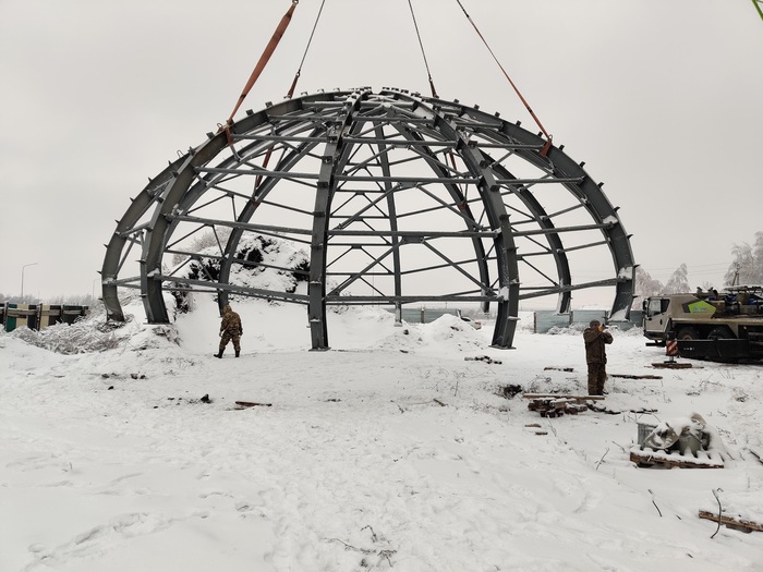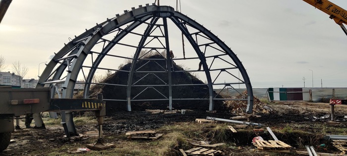 Монтировали долго, купол никак не хотел садиться на место. Конструкция нежёсткая, гуляла до того момента, пока все ноги не заварил. Но нам повезло с крановым. Профессионал. Работал он вслепую по рации.