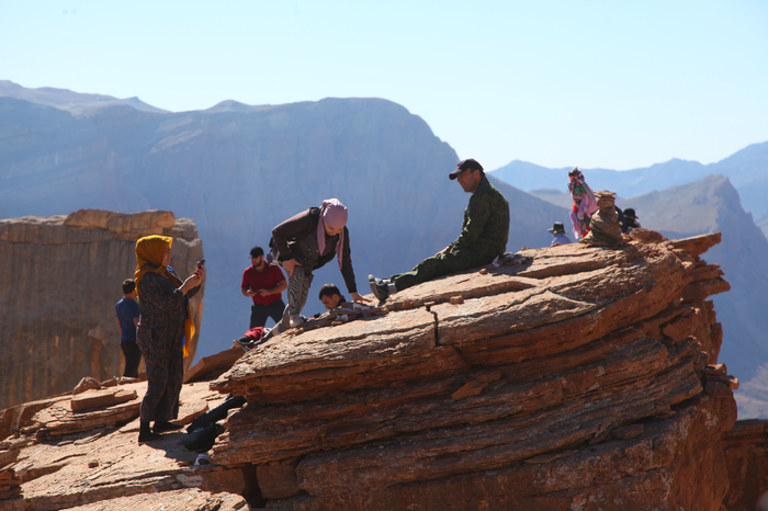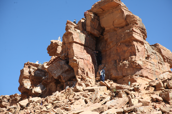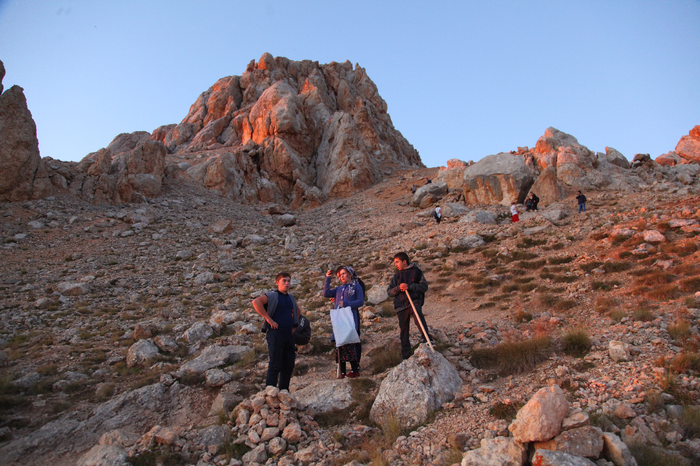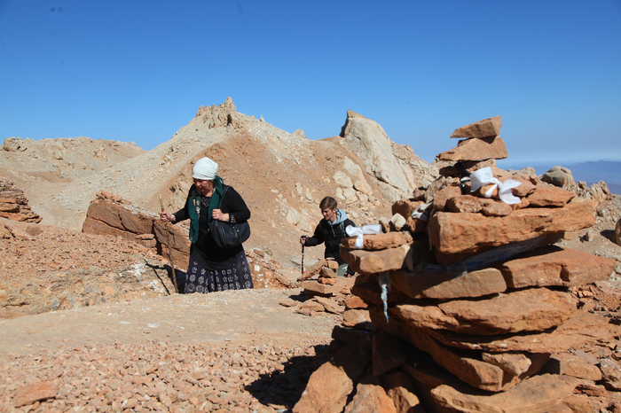 От источника до конца маршрута — еще около часа пути среди скал. Неземной красоты пейзажи напоминают марсианские. Где-то на полпути от источника до вершины люди останавливаются у скалы с выемкой размером с папаху. В нее бросают камни: кому с трех попыток удается закинуть в выемку камень так, чтобы он не покатился обратно, ждет приз — исполнение желаний.