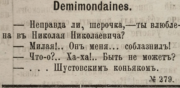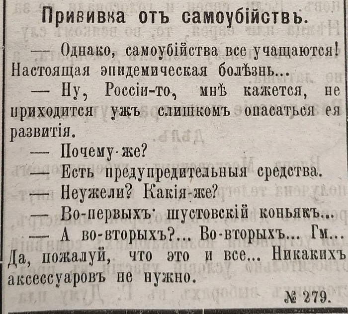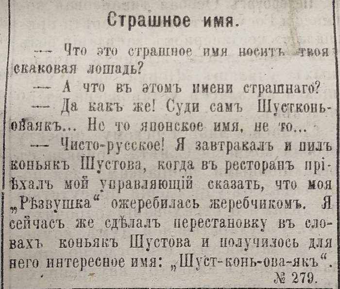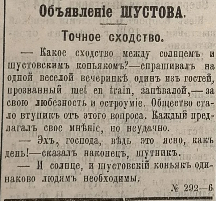 - Заказывал джинсу в прессе, придумывая загадки и анекдоты с фразой «Шустовский коньяк»: «Закон инерции. — Папа, не можешь ли ты мне указать примеры закона инерции? — Лучший пример в этом случае — шустовский коньяк. Если, положим, ты выпиваешь одну рюмку, то со следующей уже дело устанавливается само собою, по инерции».