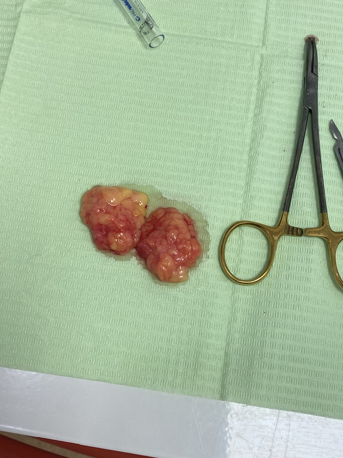 Взял скальпель и сделал надрезы по 1,5мм на слизистой , пинцетом вытащил желтоватые комочки, показал мне , я даже сфоткала на память.