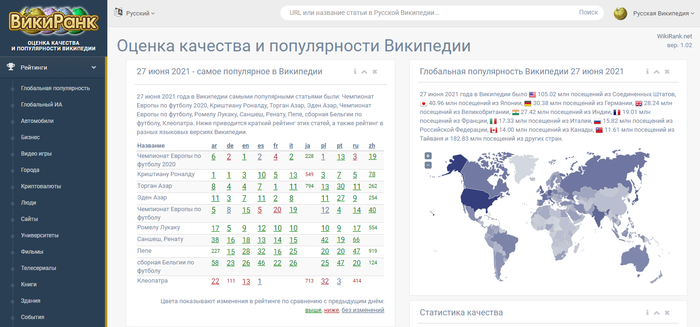 27 июня 2021 года в разных языковых версиях Википедии самыми популярными статьями были: Чемпионат Европы по футболу 2020, Криштиану Роналду, Торган Азар, Эден Азар, Чемпионат Европы по футболу, Ромелу Лукаку, Саншеш, Ренату, Пепе, сборная Бельгии по футболу, Клеопатра. Ниже приводится краткий рейтинг этих статей, а также рейтинг в разных языковых версиях Википедии.
