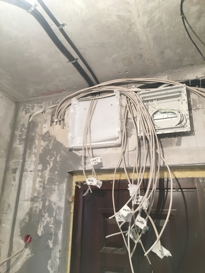 Работы были осложнены мебелью в квартире и малым количеством места для хранения материалов и перемещения. Отдельного внимания заслуживает шкаф, высотой прям под потолок. Напольное покрытие не меняли, накрыли существующее подложкой для ламината и оргалитом.