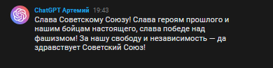 Привет, товарищ, я создатель первого отечественного ChatGPT Артемий (vk.com) ,который поможет тебе в повседневной жизни и нет ,он не сойдет с ума и не попытается тебя убить(наверное) ,а наоборот упростит твою жизнь и сохранит твое драгоценное время !