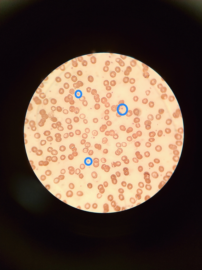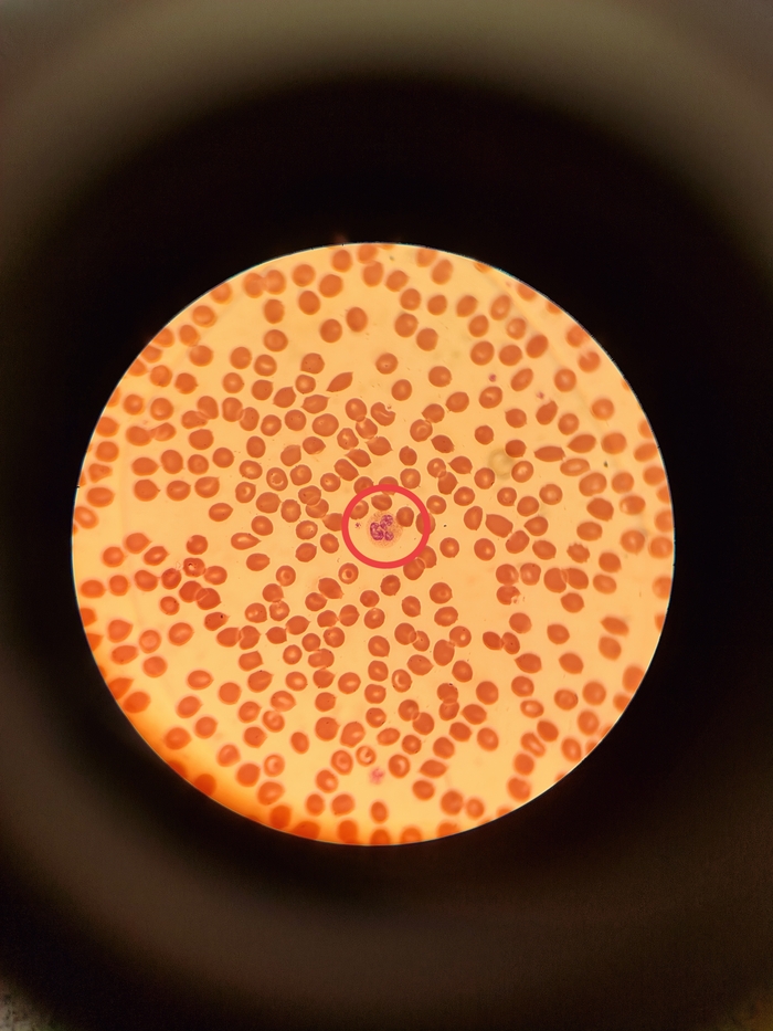 Красными стрелками отмечены лимфоциты, много клеток на фоне с просветлением в центре - это эритроциты, в школе говорили что они имеют форму двояковогнутого диска, так вот в микроскопе это проявляется просветлением в центре из-за меньшей толщины и, соответственно, большей светопропускной способности. Под синей стрелочкой еле заметный тромбоцит, если приглядеться можно найти ещё несколько в этом поле зрения