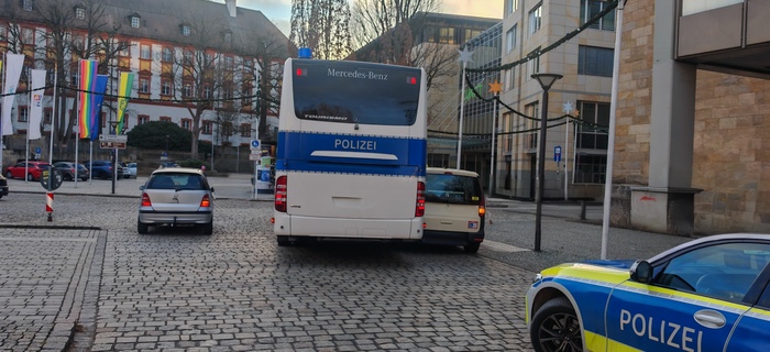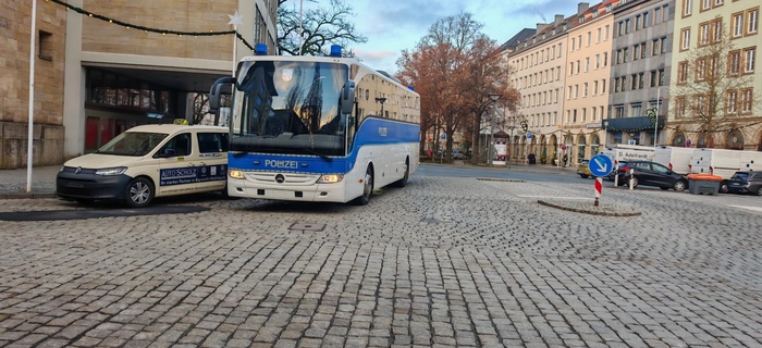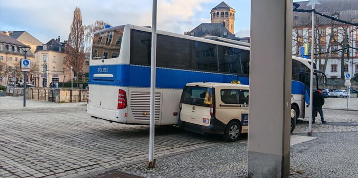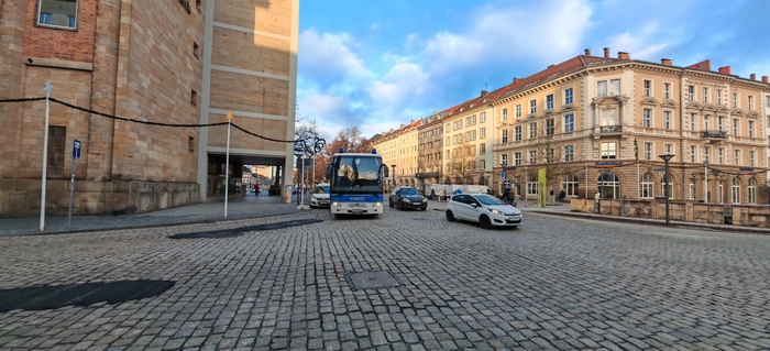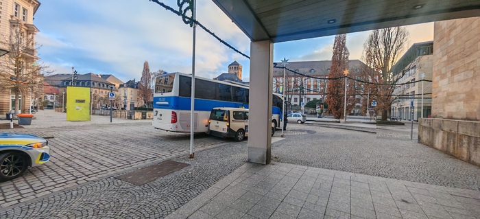 Еду с заказа на стоянку такси. Впереди меня два полицейских автобуса друг за другом едут. Едем в одну сторону, заезжаем на Люитполдплятц и прямо, в конце дорога раздвояется. Полоса справа, автобусная, превращается в обычную на последних 20-ти метрах и она поворачивает только направо ( на Каналштрассе). Левая полоса раздваивается и одна левая полоса налево поворачивает на разворот, остальное едет прямо (там налево на Опернштрассе). Немного запутано, но такая разметка. Для понимания важно только последние 20-30 метров. Автобусы на левой, я на правой. То есть я ехал за ними и когда они притормозили, потому что первый бус стал поворачивать налево, а я с той же скоростью переместился на правую полосу и уже ехал параллельно второму автобусу. И вот внезапно, второй стал поворачивать налево! Я вижу боковым зрением что он приближается ко мне, я смущаюсь дальше вправо, но водитель буса меня не видел и продолжал выдавливать. Остановился он только тогда, когда притёрся ко мне и услышал скрип повреждения.
