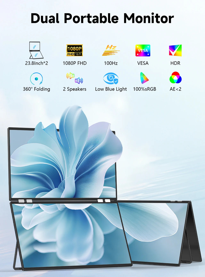 Необычное решение с двумя экранами 23.8 дюйма Full HD, расположенными вертикально друг над другом. Частота обновления 100 Гц снижает размытие в динамичных сценах. Конструкция складывается на 360 градусов, позволяя настроить оптимальное положение для работы или развлечений.