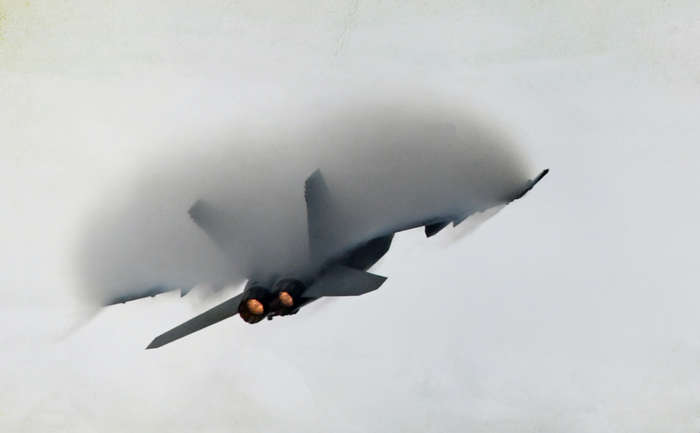 Перед вами — палубный истребитель-бомбардировщик и штурмовик F/A-18F Super Hornet, летящий со скоростью, близкой к скорости звука. Задняя часть самолета скрыта за туманным конусом с ровными очертаниями: он, словно широкая юбка, окутал хвостовое оперение. Что это и откуда он взялся?