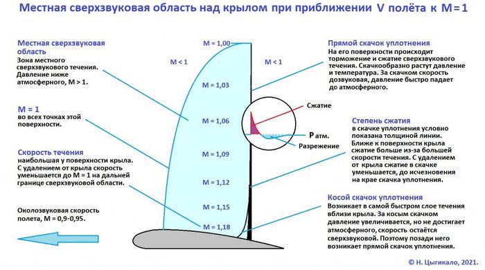 На выпуклых местах — поверхностях крыла и киля, кабины, воздухозаборников — обтекающий воздух локально ускоряется. В результате скорость обтекания в разных точках самолета оказывается разной. Больше всего эта разница проявляется на крыле.