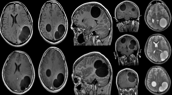 «Вот эти огромные черные пятна и есть те самые кисты, которые заняли всю правую долю моей печени, — показывая снимок КТ, говорит художница. — Самая большая киста была объемом целый литр. Внутри нее были личинки. Поэтому трогать этот пузырь нельзя было. Если хоть одна личинка попадет в кровоток, то зараза распространится повсюду».