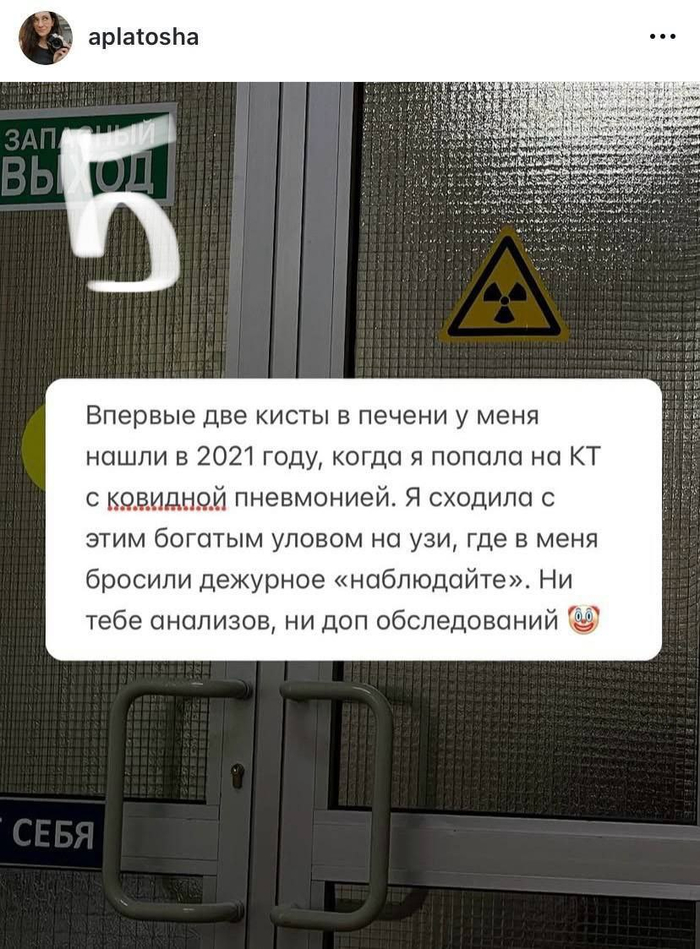 В итоге Платоновой сделали УЗИ внутренних органов, оно показало огромные кисты в печени, которые уже начали давить на желчные протоки. Александру направили в Боткинскую больницу, где при взгляде на кисты ей и сделали анализ на антитела к эхинококку и провели КТ.