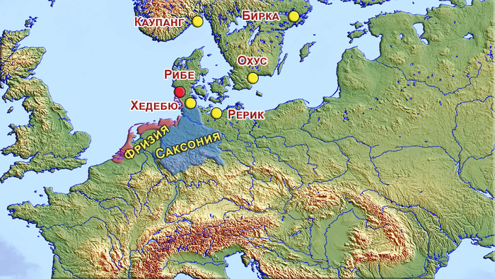 Из вышеперечисленных, Рибе был самым ранним крупным торговым центром в Скандинавии, датируемый примерно 704-710 годом нашей эры. Он расположен недалеко от побережья юго-западной Ютландии, на территории современной Дании. На реконструированной карте видно, что основная территория поселения состояла из узких прямоугольных участков в два ряда по обе стороны улицы, идущей в направлении с СЗ на ЮВ, которую пересекала основная дорога регионального значения.