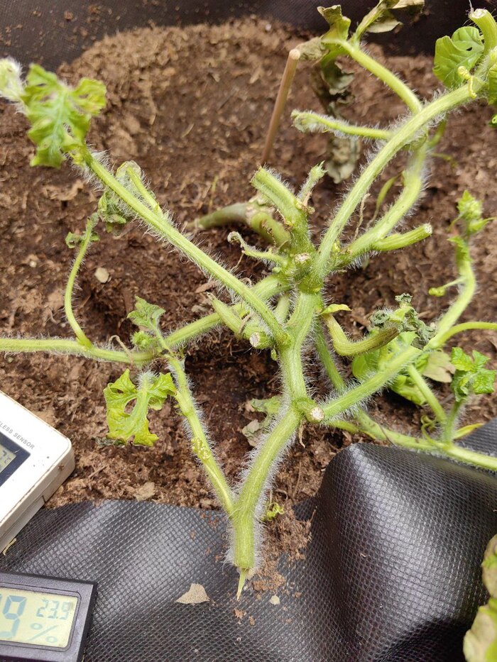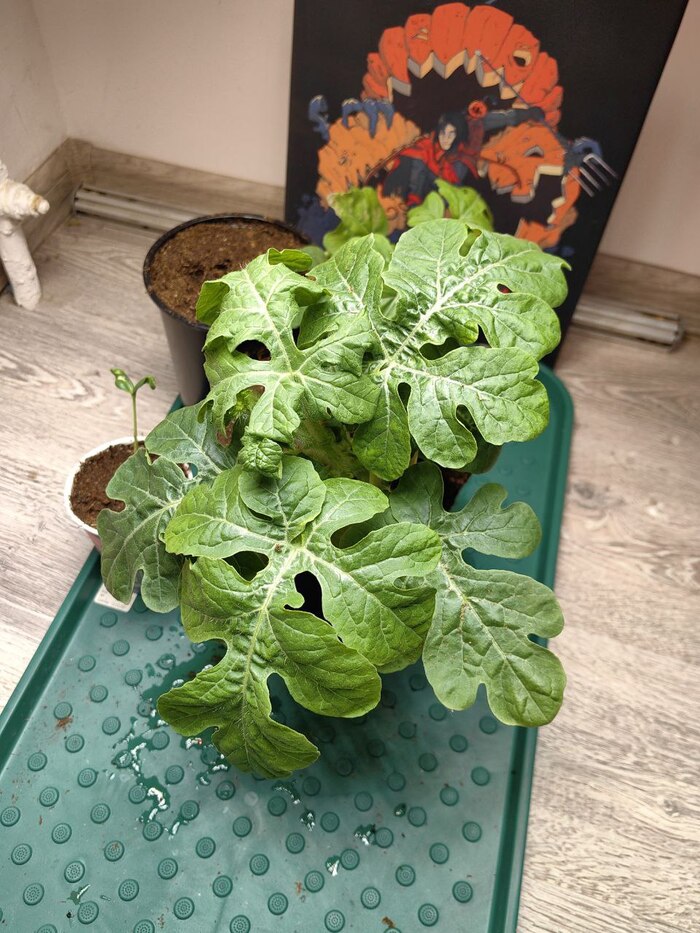 Но увы и ах. То ли я слишком долго не пересаживал арбуз, то ли еще что с ним случилось. Быть может, беда с грунтом? Сразу скажу, что норму внесения удобрений я соблюдаю, так что вряд ли дело в передозе. Но суть одна: арбуз сильно прифигел и выглядел так ужасно, что хотелось его просто выкинуть. Да и сейчас тоже хочется. В общем, стал он выглядеть так: