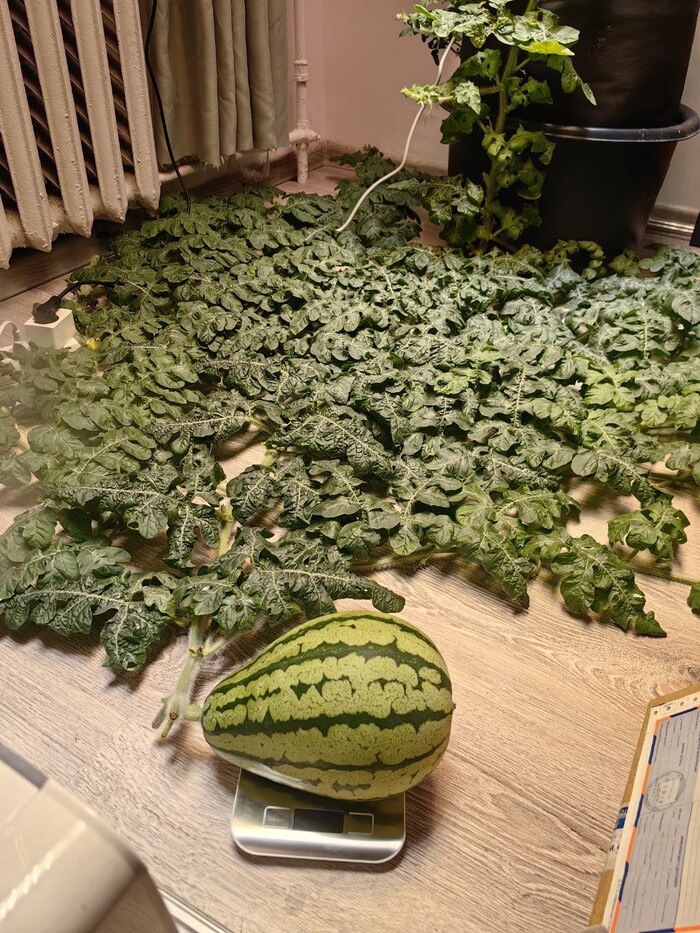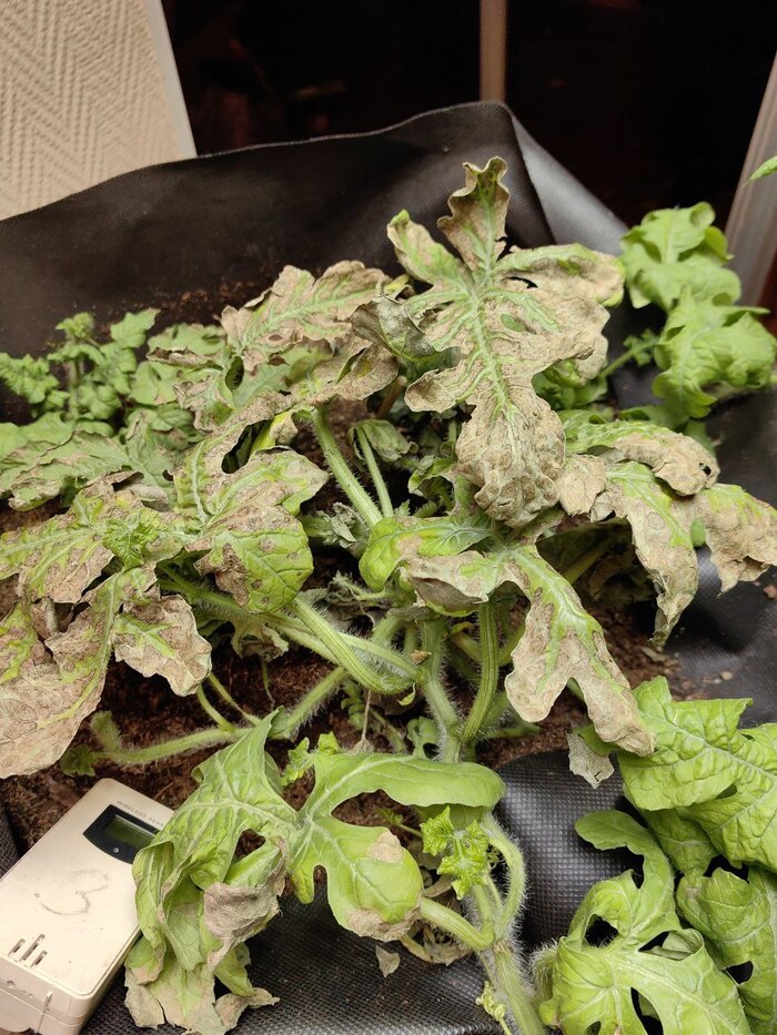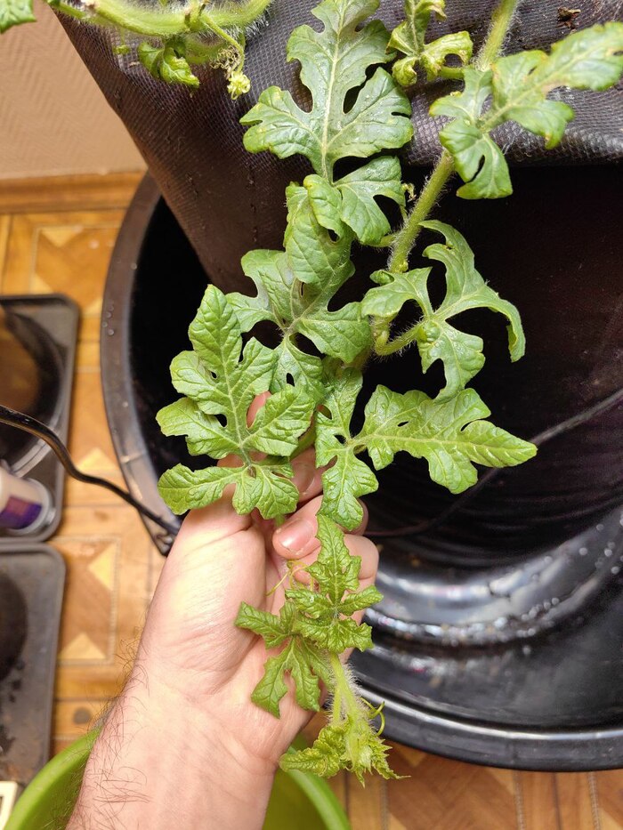 Стал я значит, искать помещение, которое можно было арендовать недалеко от дома и чтобы аренда была не слишком дорогой. Был один подходящий вариант, но там почему-то отказали. Видать, не хотят сдавать помещение сомнительным личностям. Ну ничего, можно понять. И поиски затянулись… А арбуз всё рос, и это стало большой проблемой, так как я упустил все тайминги. Ведь для правильного развития его нужно было уже давно пересадить в финальную ёмкость, а я этого не делал. В итоге ему вдруг стало хреново, листья стали сохнуть.