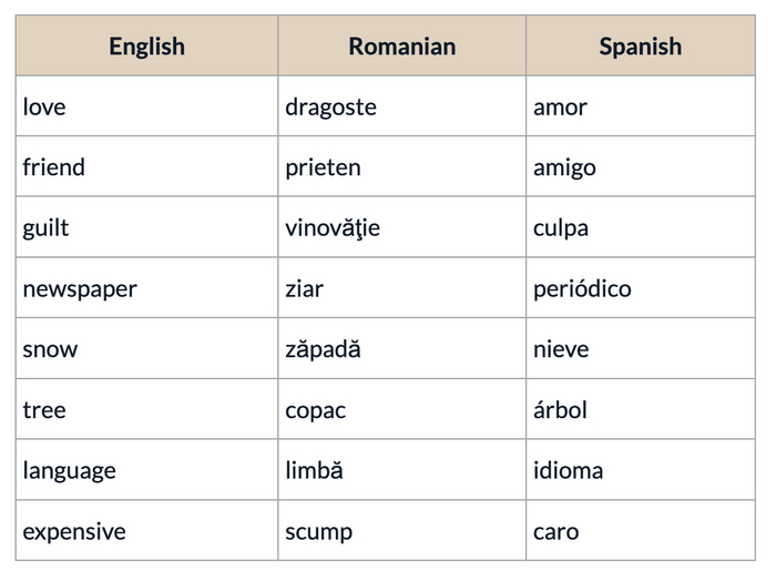Разница базовых слов в Испанском и Румынском языках