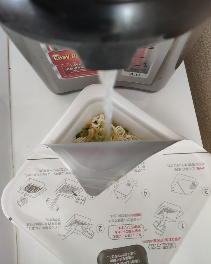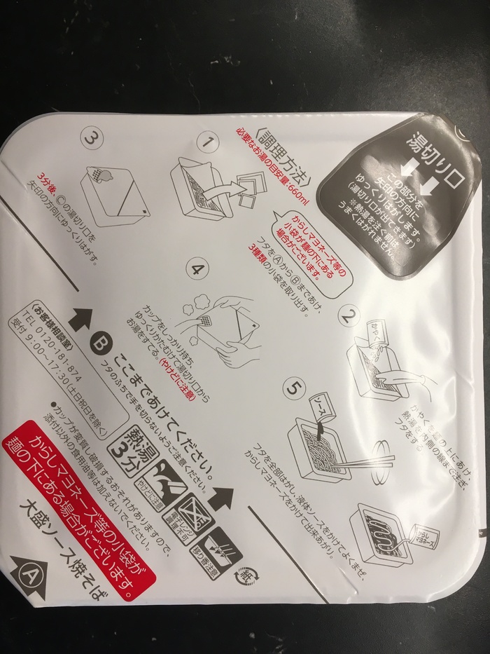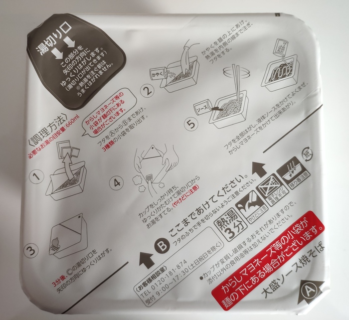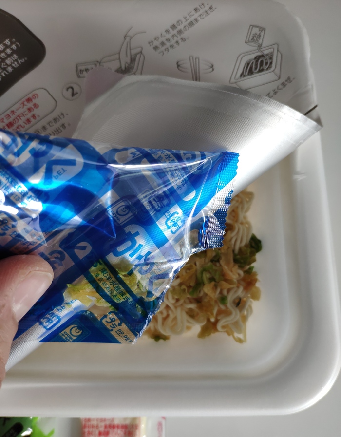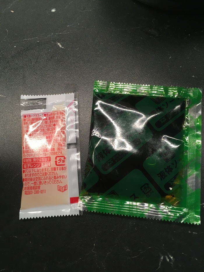 По рисункам, инструкцию, поймет даже тот, кто не отличит японские иероглифы от следов голубей на снегу. Тянем за язычок с цифрой 1, отрываем крышу до линии обозначенной цифрой 2. Достаем приправы. Здесь это соус и пакетик фурикакэ (потом расскажу)