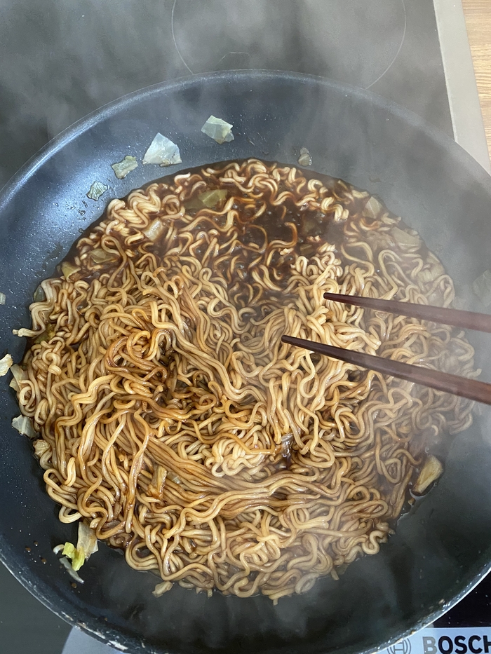 Вливаем соус, попутно удивляемся откуда в лапше взялась капуста.