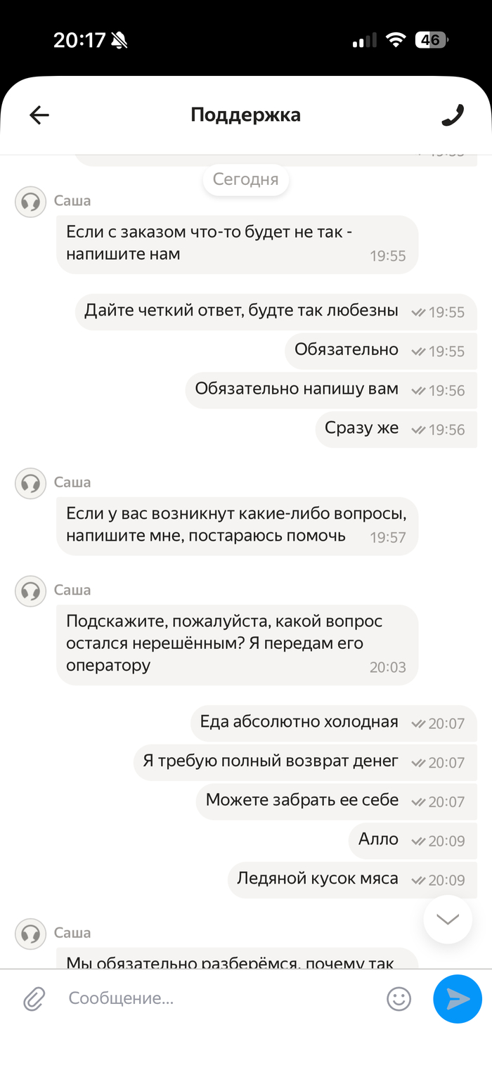 Дальше происходит следующее, магазин вычеркивает рыбу и отправляет всё остальное.. Со мной никто не связывается, хотя обычно магазины либо сами отменяют заказ, если не хватает какой то позиции, либо звонят о замене, на похожую.. Мне не звонят, а ставят перед фактом, когда курьер уже привёз, то есть, мне не дали шанса отменить заказ.. Пишу в поддержку..