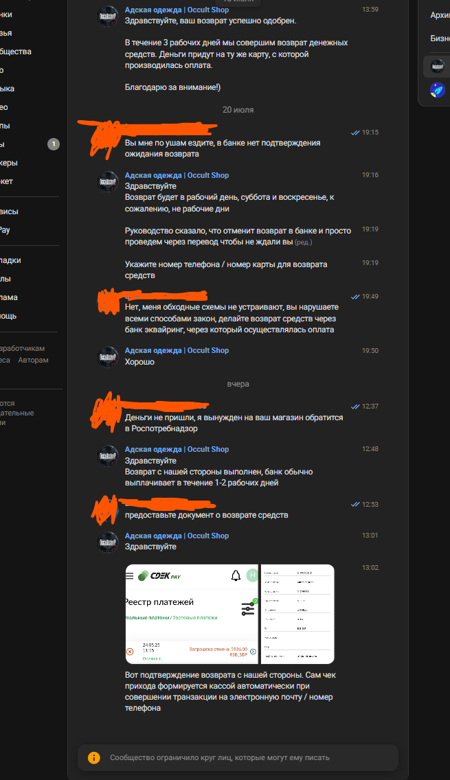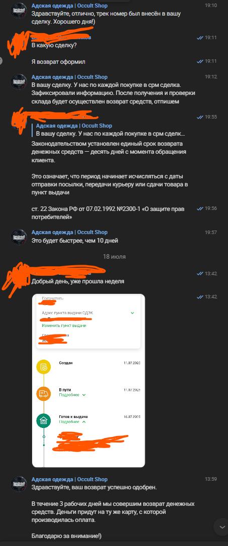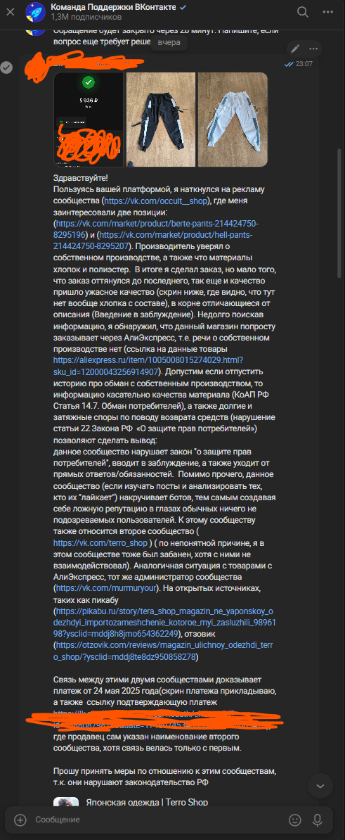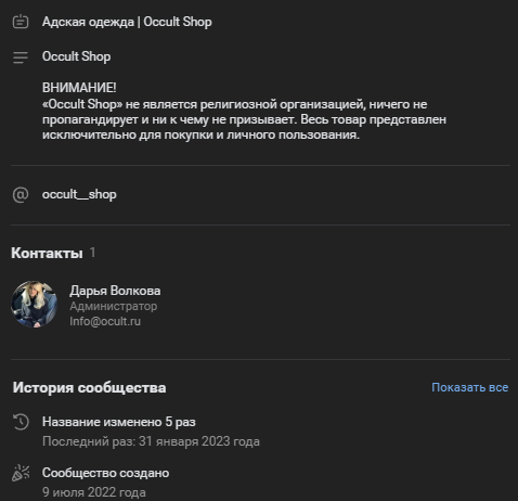 Не думал что попадусь, но я сам попался, т.к. вовремя не нашел отзывы. Наткнулся на их мошенничество, но с другой их стороны, а именно с occult__shop (админ тот же), заказал две пары штанов (https ://vk . com /market /product /berte-pants-214424750-8295196) (https :// vk . com/ market /product /hell-pants-214424750-8295207) при оплате товара ждал больше 8 недель (обещали максимум 7), ужаснулся, увидев качество, потребовал возврат, после чего полетел в чс, как только прошел документ об возврате (видимо, чтоб отзыв не оставил).