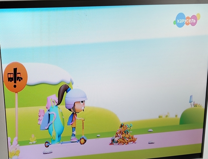 Сломался у нас андроид тв, снабженный кинопоисками и прочими окками. А душа детская требует мультфильмов и вот прям щас. Ну, ок. Пользуемся тем, что есть. А есть у нас аж целый Федеральный детский канал. (Для начала, конечно, пришлось объяснять, что фиксиков по щелчку включать никто не будет, извиняй, современное дитя). Включаю, отворачиваюсь по своим делам, ибо "Три кота" на "семейном совете" одобрены и приняты к просмотру. Через некоторое время обращаю внимание на экран и меня начинает жёстко бомбить. На экране вот такая вот жуткая жуть: