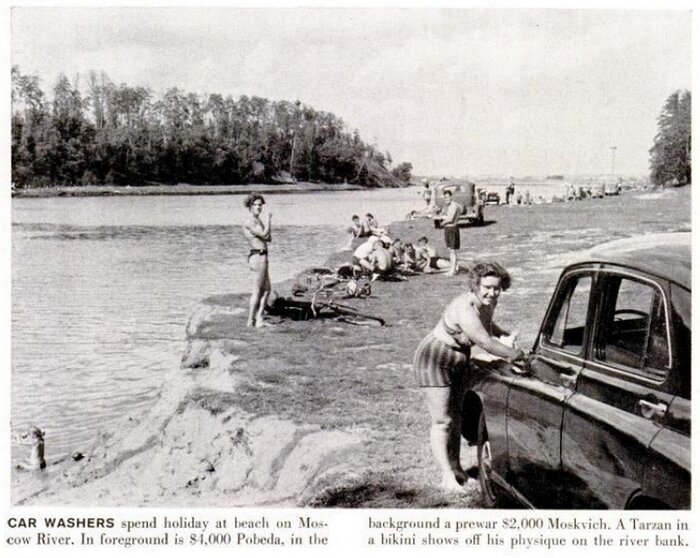 Пляж на Москва-реке, где отдыхают и моют машины. Горделиво стоящего у берега мужчину автор LIFE назвал «Тарзаном».