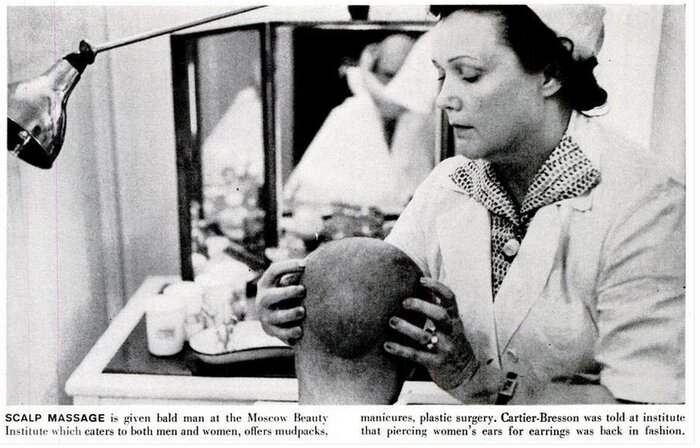 Специалистка Московского института красоты и гигиены делает пациенту массаж кожи головы. В заметке также сказано, что у советских женщин снова в моде прокалывание ушей.