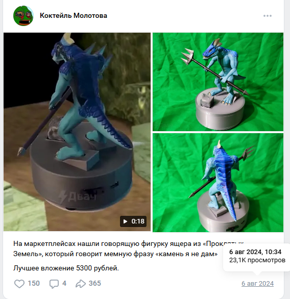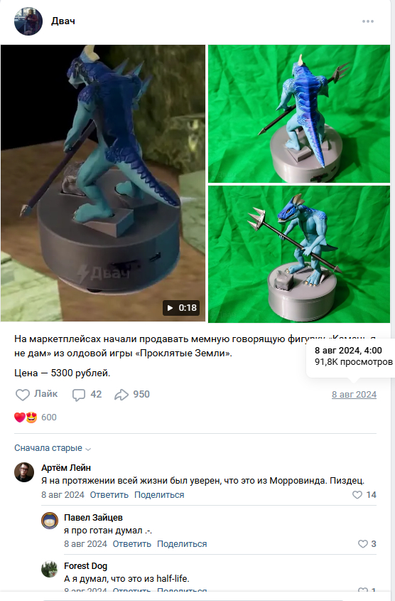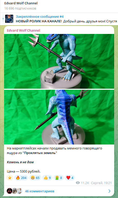 Я уже выкладывал своего говорящего Ящера "Камень я не дам", но то было давно и я созрел поделиться подробностями его создания: как получал разрешение на изготовление от главного исполнительного директора Nival Сергея Орловского, как один шортс помог получить миллионные охваты и стать вирусным и, наконец, как именно создавалась фигурка.