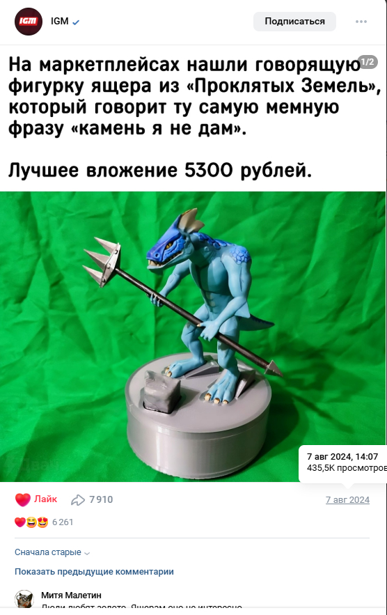 Совершенно неожиданно ящер стал инфоповодом для многих геймерских сообществ! Посты с моим ящером оказались в десятках сообществах ВК и телеграмм-каналах: IGM, Edward Wolf, Двач и многие другие. У одного IGM пост набрал 400к+ просмотров.