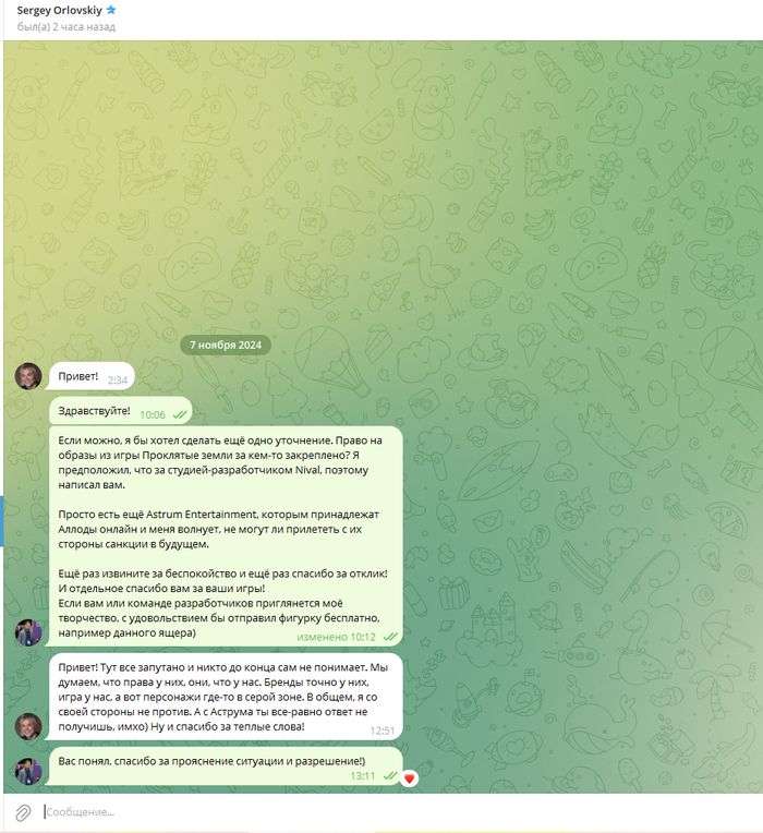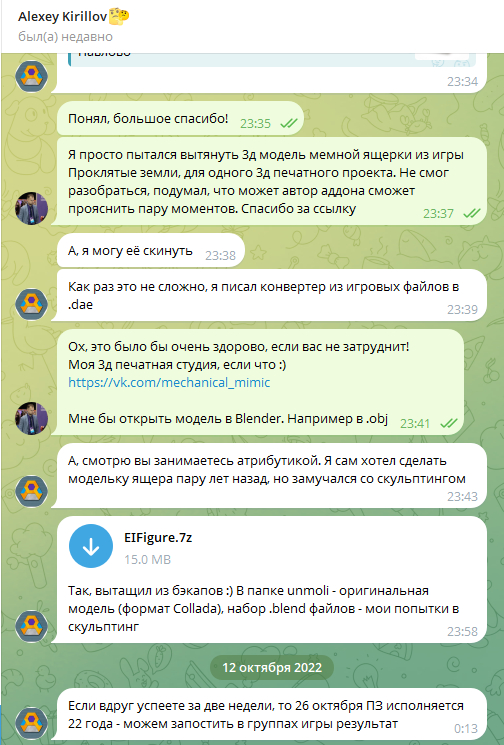 Когда-то много лет назад, когда я ещё только-только начинал осваивать 3D-графику, я ему писал и интересовался, в каких программах работать и как делать игры, да-да, вопросы были глупы и наивны, но я это помню и, возможно, это оказало не последнюю роль в том, что много лет спустя и я выпустил свою игру, ведь он меня не проигнорировал и дал мне какое-то направление для дальнейшего пути, что для меня ценно и за что я признателен.