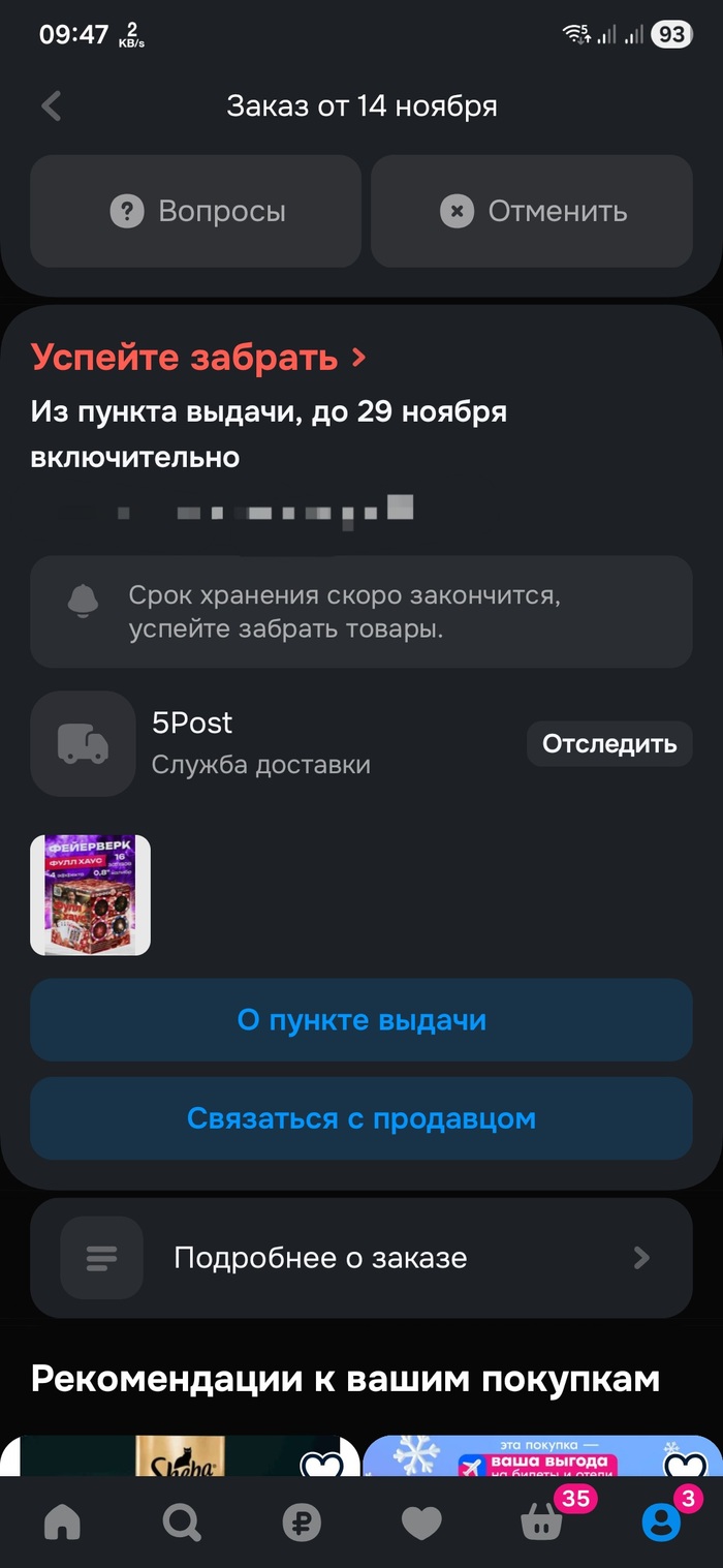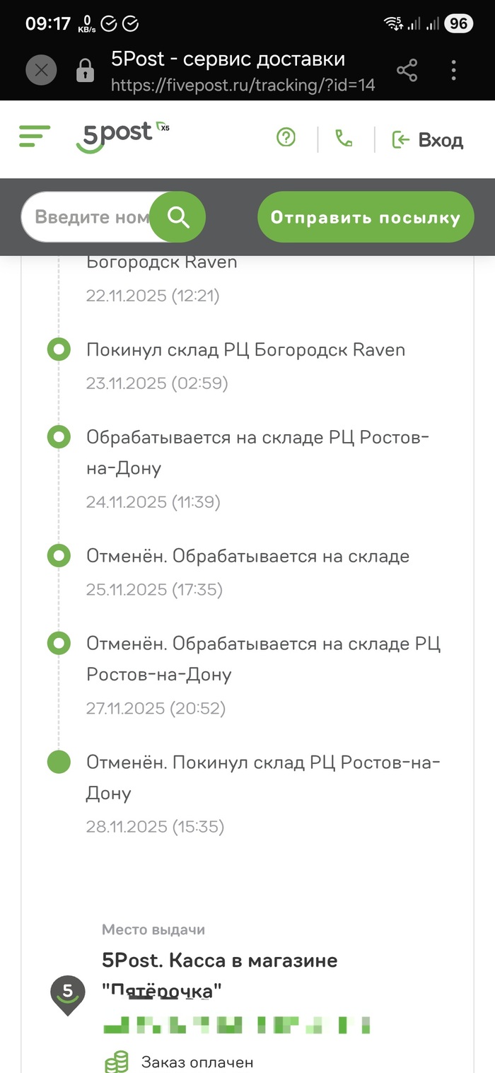 Сегодня 29 ноября озон присылает мне настойчивое уведомление о том, что заказ нужно забрать, тк заканчивается срок его хранения. Иду опять на сайт 5post и вижу, что ещё 25 ноября в транзитном городе заказ отменился и едет обратно продавану. При чем я его не отменяла! Повторюсь, в личном кабинете висит статус "Ожидает в ПВЗ'.