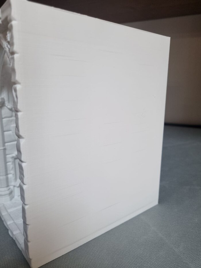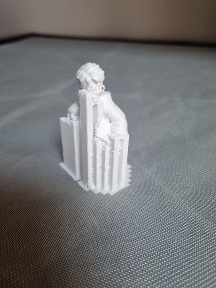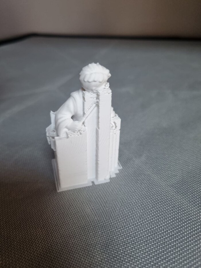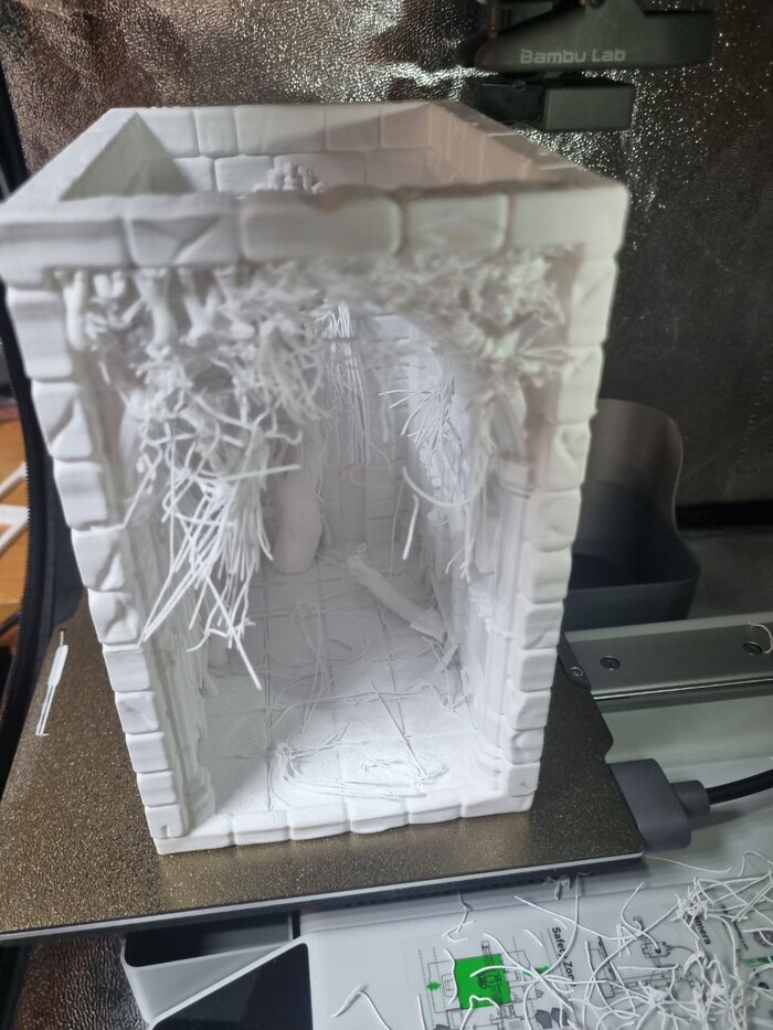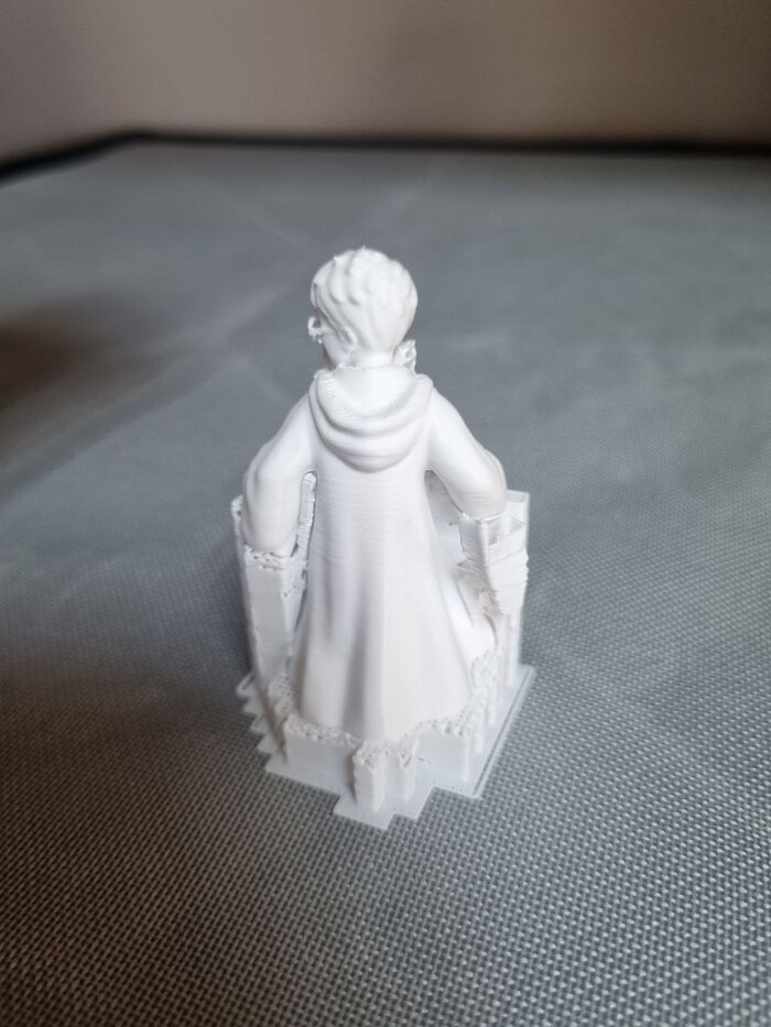 На ночь отправил на печать модель "выручай комнаты" из Поттерианы для книжной полки (ставится между книг для антуража/декора), печать длилась 10 часов с хвостиком, сопло так же стандартное 0,4, пластик Есун ПЛА белый, за 1300р (вроде так стоил). До 22.00 где-то контролировал печать через удаленку со смартфона, все было гуд, потом лег спать. Утром проверил - печать уже закончена, принтер в режиме "сна" (или ожидания, как угодно), но что удобно - при запросе со смартфона - принтер пробуждается и камера показывает что видит... и там я уже увидел все эти прекрасные лохмотья от упавших поддержек.... мдяяя. Но, несмотря на это, фигура получилась хорошая я считаю. Правда наружние стенки сплоховали, но их не видно будет. Сейчас загрунтовал модель, буду пытаться раскрашивать.