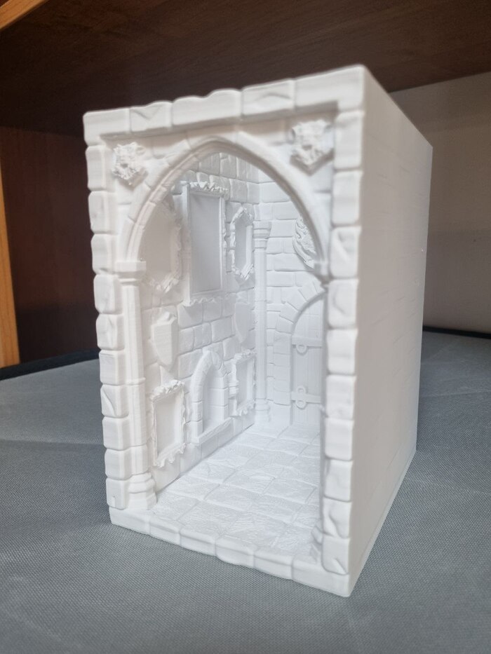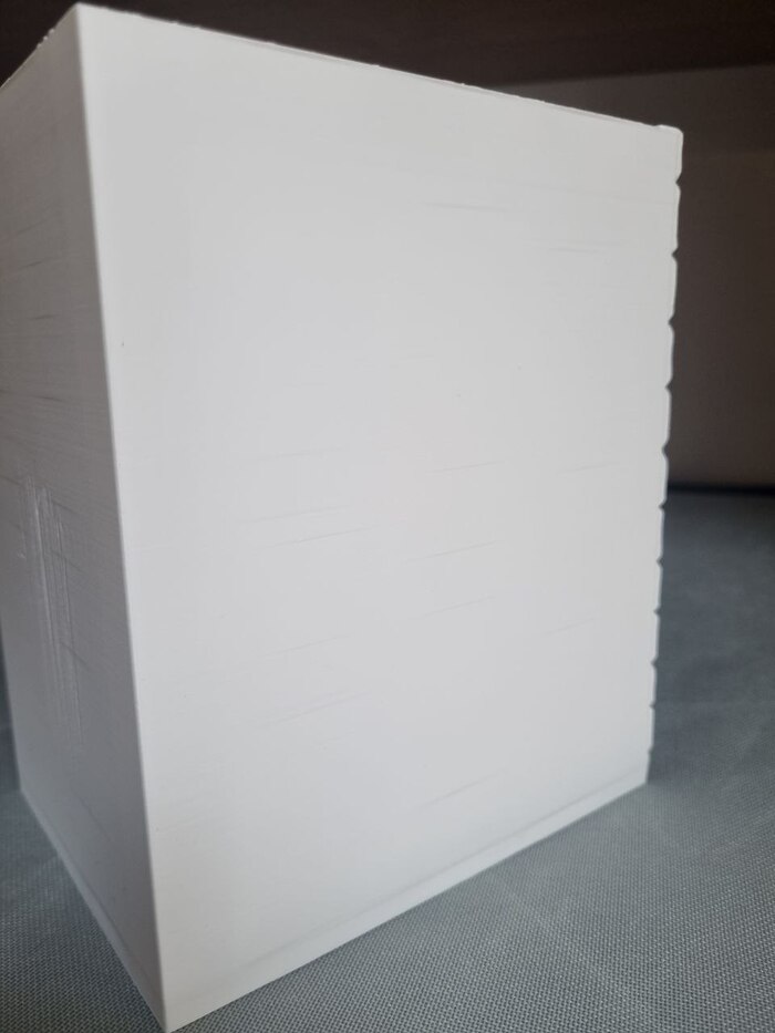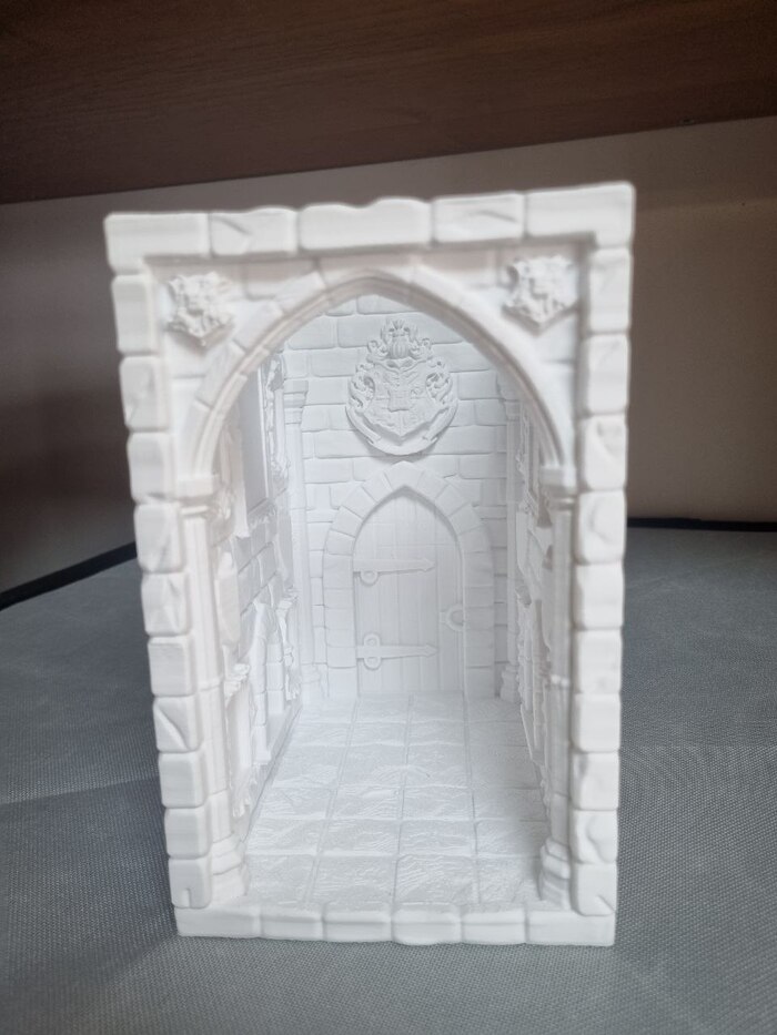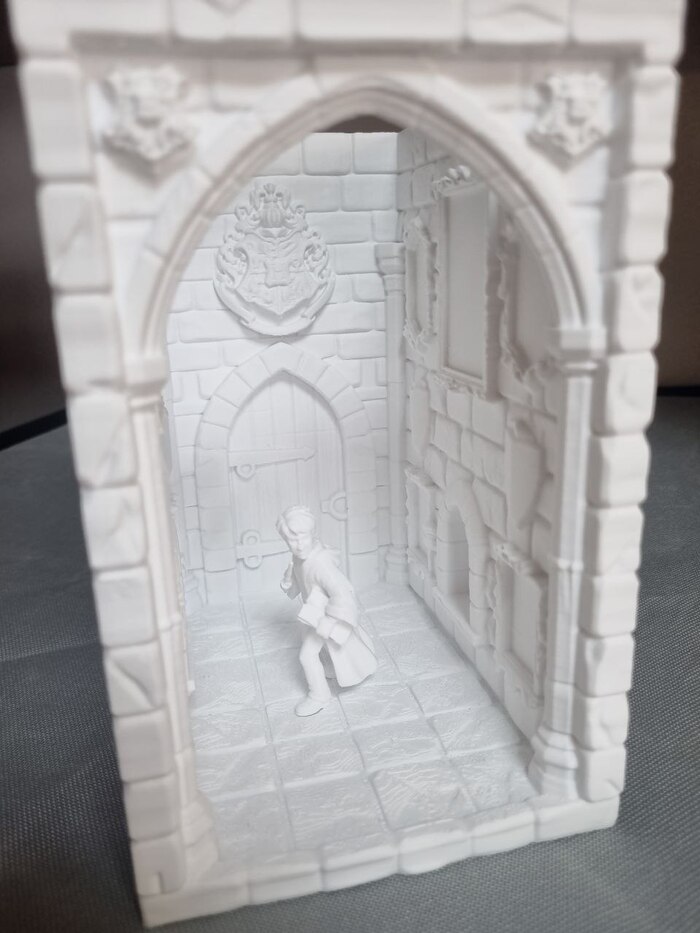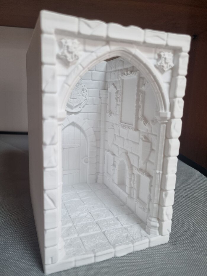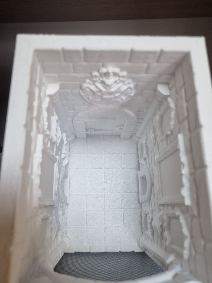 На ночь отправил на печать модель "выручай комнаты" из Поттерианы для книжной полки (ставится между книг для антуража/декора), печать длилась 10 часов с хвостиком, сопло так же стандартное 0,4, пластик Есун ПЛА белый, за 1300р (вроде так стоил). До 22.00 где-то контролировал печать через удаленку со смартфона, все было гуд, потом лег спать. Утром проверил - печать уже закончена, принтер в режиме "сна" (или ожидания, как угодно), но что удобно - при запросе со смартфона - принтер пробуждается и камера показывает что видит... и там я уже увидел все эти прекрасные лохмотья от упавших поддержек.... мдяяя. Но, несмотря на это, фигура получилась хорошая я считаю. Правда наружние стенки сплоховали, но их не видно будет. Сейчас загрунтовал модель, буду пытаться раскрашивать.