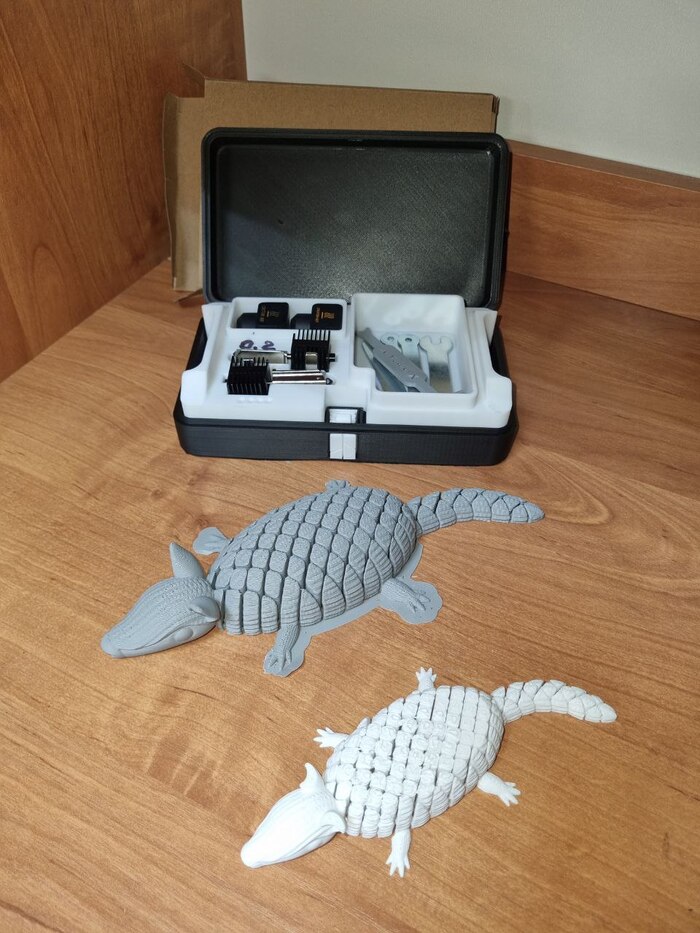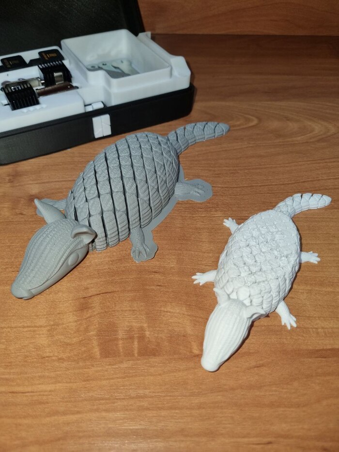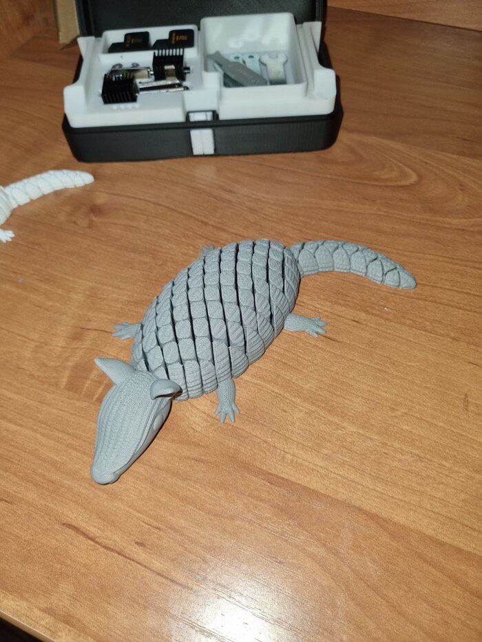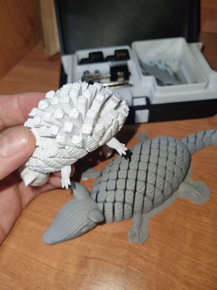 Попросила у меня супруга напечатать ей такого вот анти стресс-броненосца (увидела где то в рилсах/сторисах у кого-то). Попытка первая успехом не увенчалась (белый цвет). Пластик был Есун ПЛА+, настройки из профиля бамбу, скорость подредактировал (уменьшил), и процент заполнения поставил 10 против 15 стандартных. Размер модели изменил от первоначальной. И еще (не знаю важный момент или нет) слайсер предложил упростить модель по количеству треугольников, что я и сделал. Так вот, где-то на 80% готовности модель сорвало со стола, пичалька, но урок...