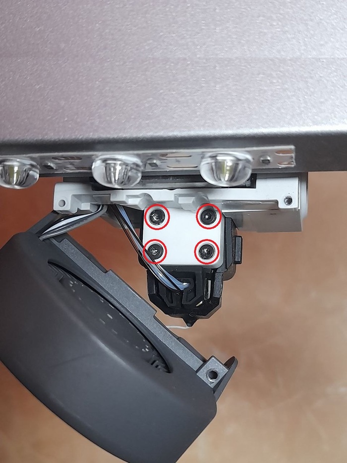 После снятия системы обдува, сзади открывается доступ к 4 винтам крепления нагревательного блока. Протягиваем их шестигранником (делаем это без фанатизма, дабы не сорвать резьбу в алюминиевом блоке)