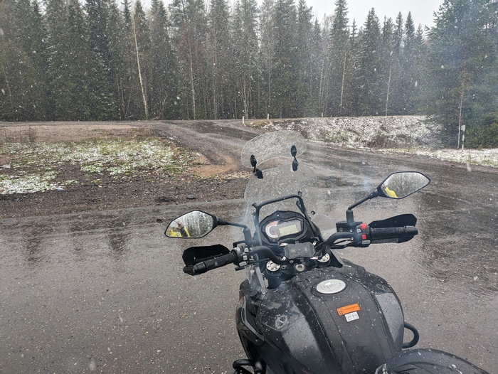 1 день. СПБ-Вологда, погода с самого утра была холодной, в районе 5-7 градусов, но положительный момент – это единственный «сухой» день в поездке. Регулярно делал остановки, чтобы отогреваться. Купленные на озоне перчатки с подогревом на аккумуляторах оказалась такая себе затея. Аккумуляторы высаживались в течение 2-3 часов, заряжались примерно столько же. Лучше все-таки заморочиться и поставить нормальный подогрев ручек руля.