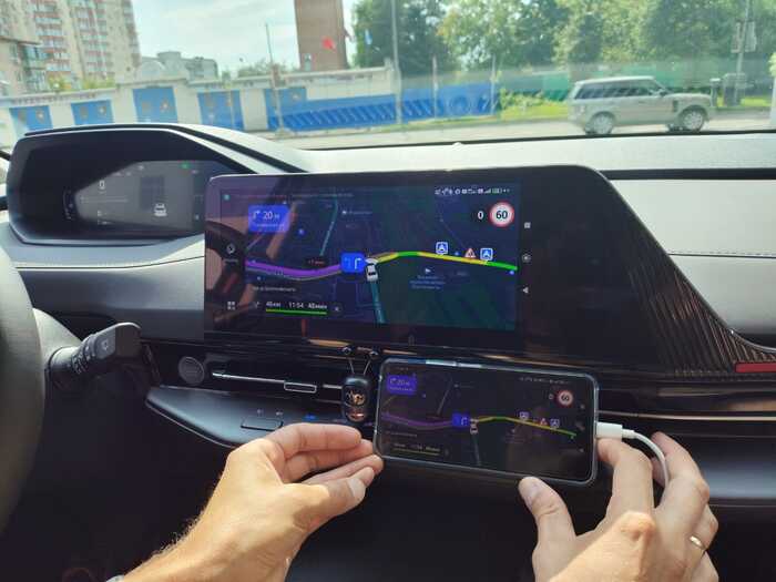 Что происходит. На ГУ идет отображение онлайн экрана смартфона (как дублирование экрана в винде), можно нажимать на экран смартфона, можно нажимать на экран ГУ - все нажатия идентичны, работает свайп, работает мультинажатие, зум и прочее. И самое главное - работает без ограничений при движении (по сути, он показывает экран, а что показывает экран - карту, фото или видео - ему неважно). Ну и карты Яндекс на весь экран с полным контролем.
