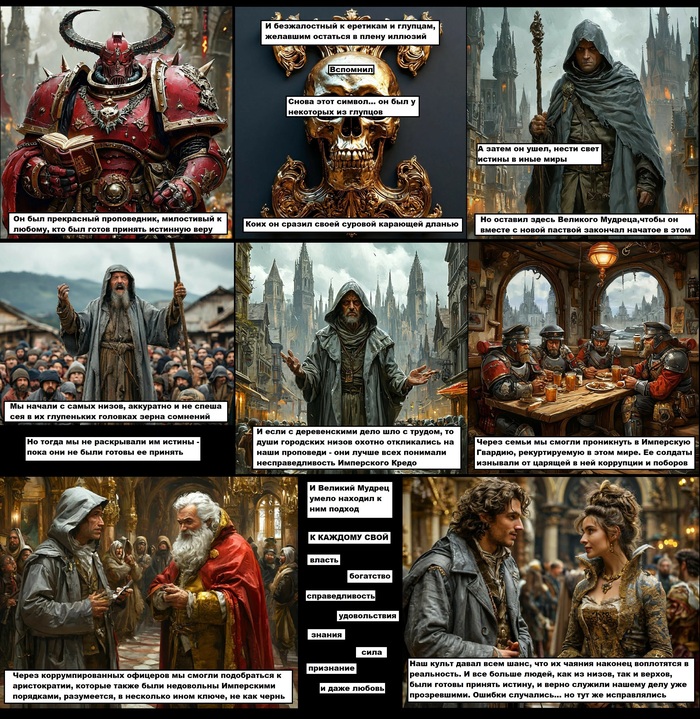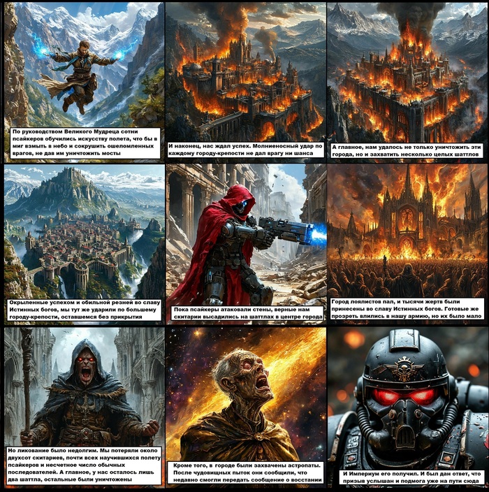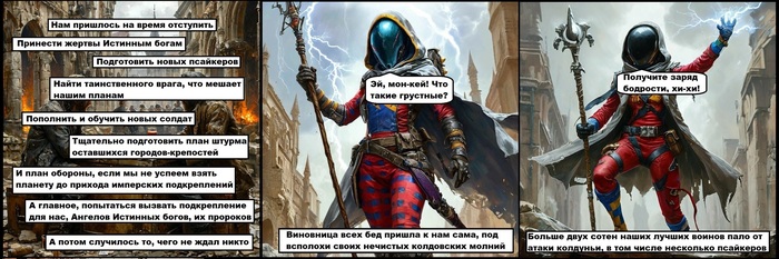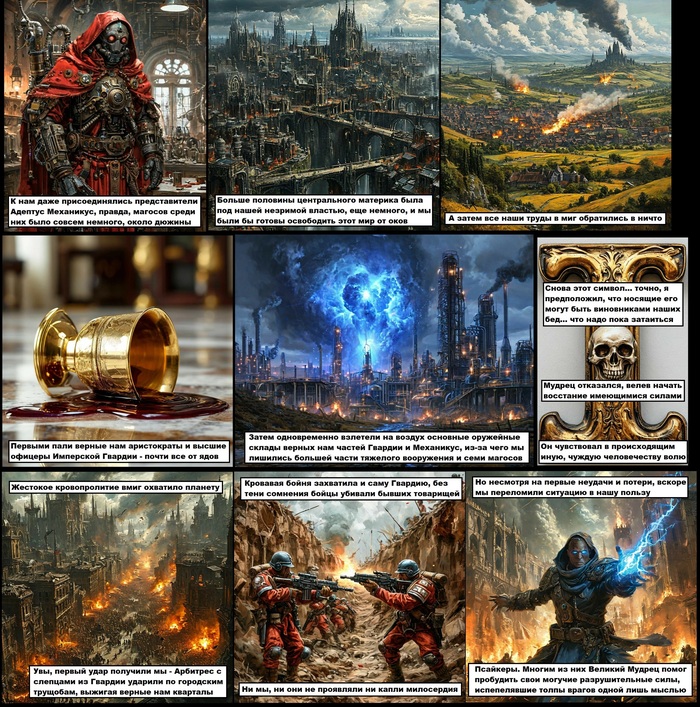 О том, как и почему все было задумано, в этих постах: Рассуждения о том, допустимо ли использовать нейросети для создания тематического контента, на примере Warhammer 40000 и Комикс "Воспоминания о хаосе. Часть 1. Во имя Темных богов!"