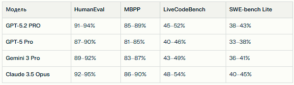 На SWE-bench Lite (тесты реальных багов из GitHub) GPT-5.2 PRO решает 38–43% задач — это хороший результат для универсальной модели, хотя узкоспециализированные coding-модели могут показывать до 50–60%.