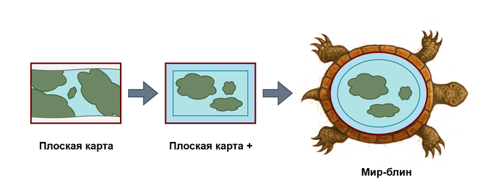 Если же я решу остаться в 2D на плоской карте, то, скорее всего, я перейду к мир-блину, которому придам красивое оформление в виде карты на спине черепахи и водопадами по краям. Возможно, в качестве эксперимента, попробую добавить два блина в качестве альтернативного режима игры.
