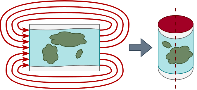 Можно телепортировать юнит не на другую сторону прямоугольной карты, а на ту же, но только с другого края карты. Таким образом, в трехмерном пространстве планета приобретает форму, которую, сложно объяснить словами. Мой мысленный эксперимент говорит, что поведение юнитов около полюсов будет очень странным, поскольку будет доступно множество телепортаций, в том числе на небольшие расстояния, что может запутать игроков и будет смотреться некрасиво. Я назову такой мир замкнутой картой.