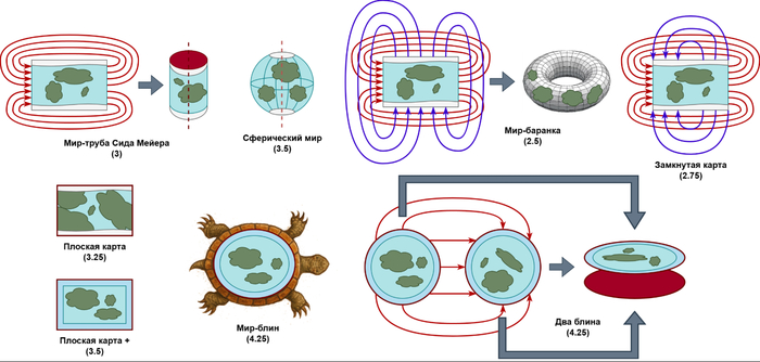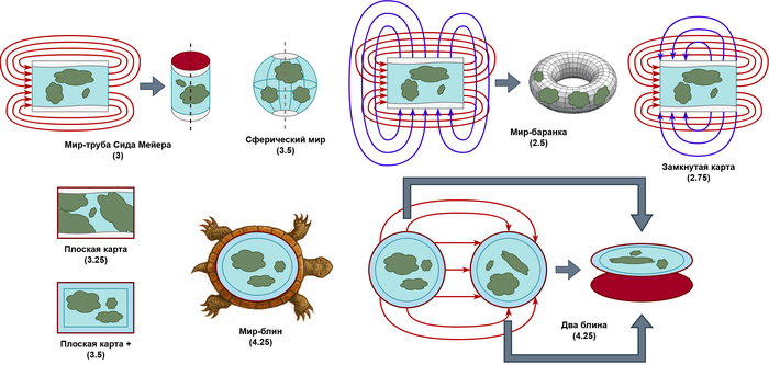 Два блина - этот мир позволяет получить очень интересный игровой процесс, при этом, он пытается отобразить сферическую планету по полушариям, хоть и с искажениями.