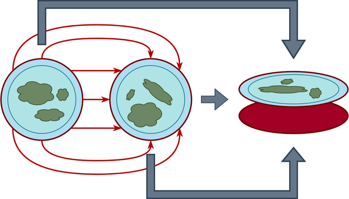 Круглая карта очень сильно напомнила мне земное полушарие, а если есть одно полушарие, то можно добавить и второе. Помимо основного мира блина, игра будет одновременно проходить ещё и на втором, а юниты по краям будут перемещаться между блинами. Такой мир можно отображать точно также как и плоскую карту, только с возможностью переключаться между полушариями планеты. Такой мир может создать множество интересных и захватывающих игровых ситуаций, а также позволит добавить несколько интересных режимов, например сделать так, чтобы полюса планеты были в центре полушарий (вид сверху и снизу на планету). Давай назовем такую не обычную карту двумя блинами.