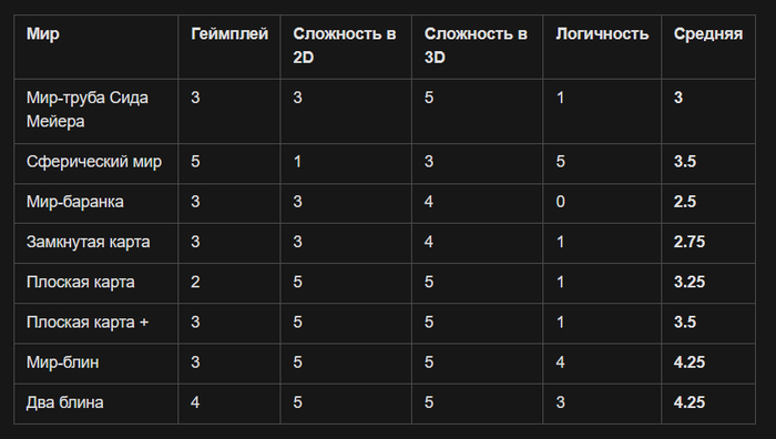 Конечно я не мог пройти мимо сравнения разных миров, поскольку такое разнообразие карт ставит перед нами новую задачу - понять, как из этого выбрать лучшие варианты для 4x стратегии. Я определил несколько критериев мира и буду оценивать их по 5-бальной системе их для каждого из миров. Во всех критериях чем выше оценка - тем лучше.