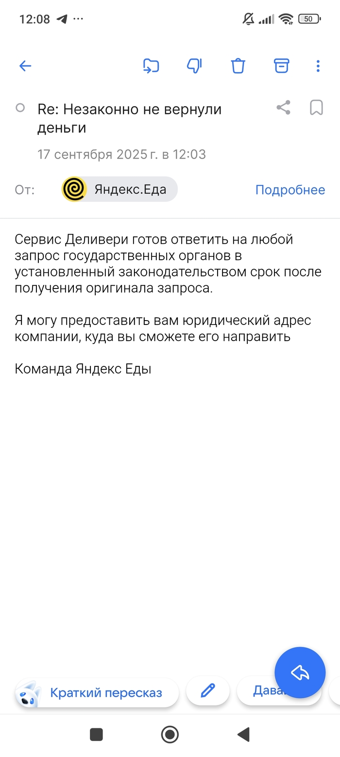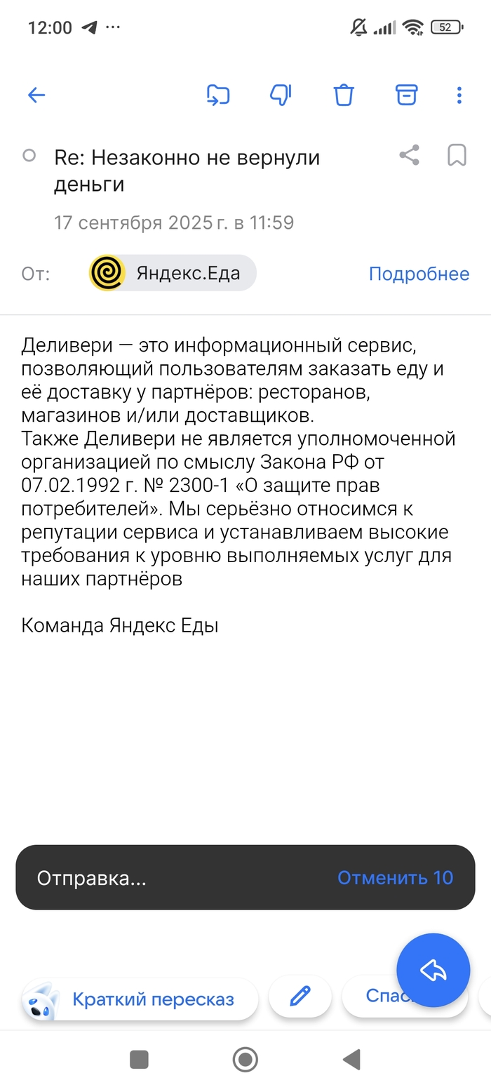 Специально решил писать пост по прошествию недели, так как матерных слов в голове поубавилось. Первый раз встретился с настолько плохим сервисом и отказом в возврате средств за явный косяк сервиса. Но это же Яндекс и Delivery Club, ожидать от них большего в наши непростые времена, видимо, не стоит. А всё это я пишу, чтобы ещё раз предостеречь - не пользуйтесь Яндексом (их Delivery Club'ом), не надейтесь получить хороший сервис и будьте всегда внимательны. А если хотите доставку - попробуйте рестораны со своими доставками. В моей практике, если они и косячили, то или деньги возвращали сразу или извинялись так, что довольны были все. Ну а Яндексу и его работникам желаю питаться только едой, привезённой в таком виде. Это ведь нормально, да? А всем остальным - хорошего дня!