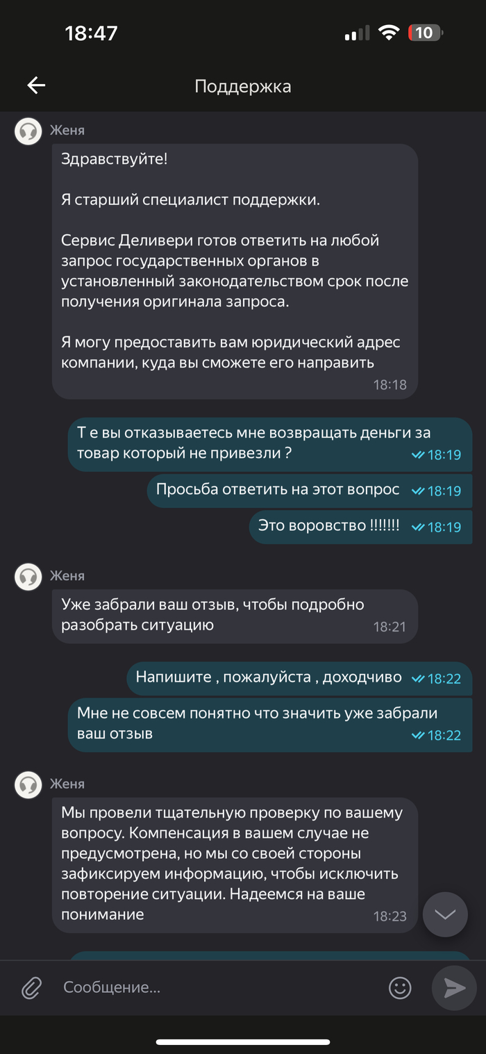 Я сразу попросил возврат денег, так как вкусно поесть этим вечером уже не надеялся. Игнор поддержки и ответы от бота ещё больше раздражали голодного и злого меня. Где-то в этот момент мы также позвонили в поддержку, ещё надеясь, что просто получим телефон курьера и попросим его вернуться (или хотя бы донесем до него, что он ошибся), но надежды на разум в Яндексе (Delivery Club) разбились о суровую реальность некомпетентных людей. Особенно порадовала "Старший специалист Татьяна" (как она представилась по телефону), объяснившая, что ей далеко наплевать на нашу проблему, а с полученным заказом можем "действовать по своему усмотрению". Ну что поделать - пришлось идти в магазин, покупать продукты и готовить ужин, попутно проклиная Delivery. И вот, когда мы уже вкусно отужинали, благодаря Eurospar и его готовой еде, звонок в дверь - и, вы не поверите, это был курьер Delivery! Он осознал свою ошибку, раскаялся и решил всё-таки привезти наш заказ! (На часах 19:50). Тут нужно каяться и мне - я, как честный человек, взял заказ и отдал ошибочный (правильно действовать в таком случае - не открывать дверь и матом гнать курьера, насколько я понял). И честно написал об этом в поддержку: