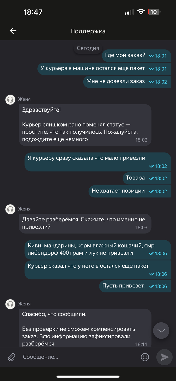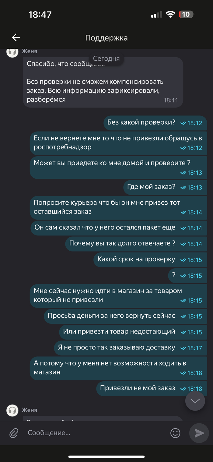 Сделал сегодня заказ через Яндекс в Магните. Приехал курьер, вручил мне пакет. Захожу в квартиру, открываю, вижу, что заказ не мой. А курьер уже сбежал. Открываю приложение, связи с курьером уже нет. Звоню в поддержку, говорю, курьер перепутал пакеты, пусть вернётся, пока далеко не уехал. Там, вроде, живой человек, но отвечает как робот: зайдите в приложение, пришлите фотографию... Алё, говорю, в чём проблема связаться с курьером, попросить его вернуться? - Зайдите в приложение, пришлите фотографию... Да вы меня слышите, нет? - Зайдите в приложение, пришлите фотографию... Ладно, пишу в приложении, что курьер перепутал пакеты. Через пару секунд приходит сообщение: "Разберёмся. Деньги вернули. Всё оставьте себе". Ребята, в чём проблема позвонить курьеру? Я не просил возврат. Мне не нужен чужой заказ. В итоге с курьера вычли стоимость двух заказов. Отработал мальчик смену.