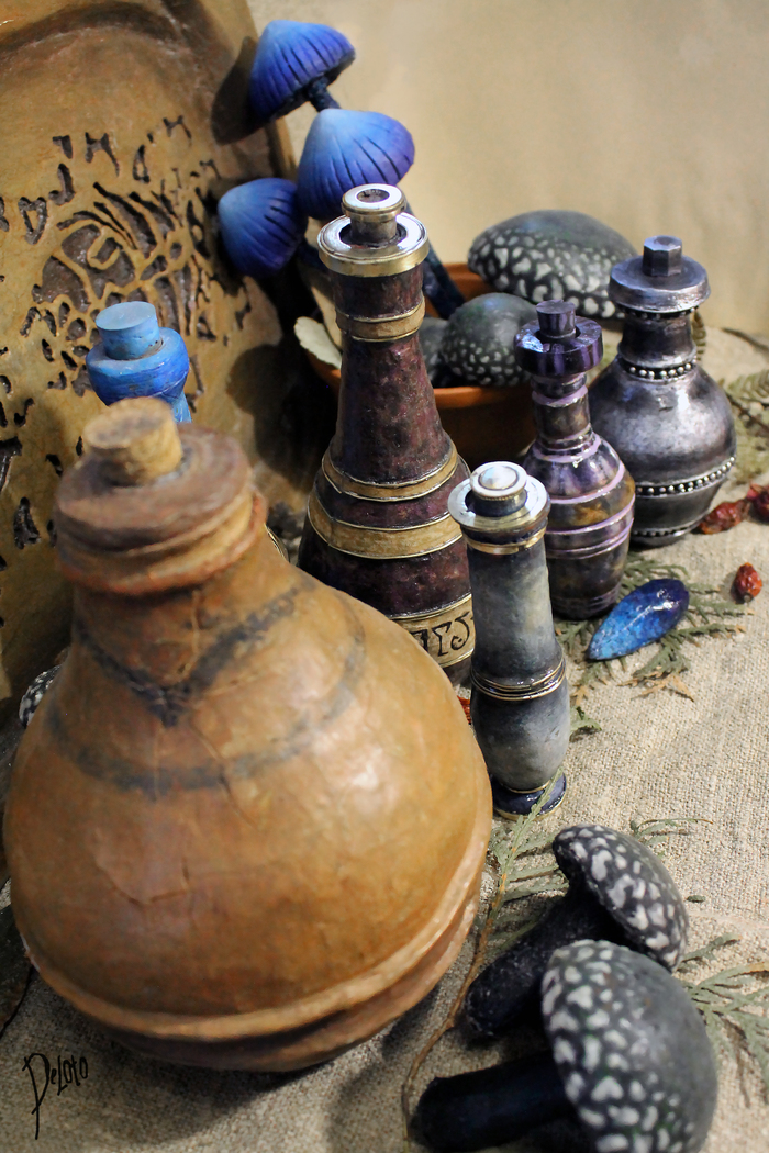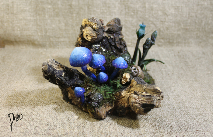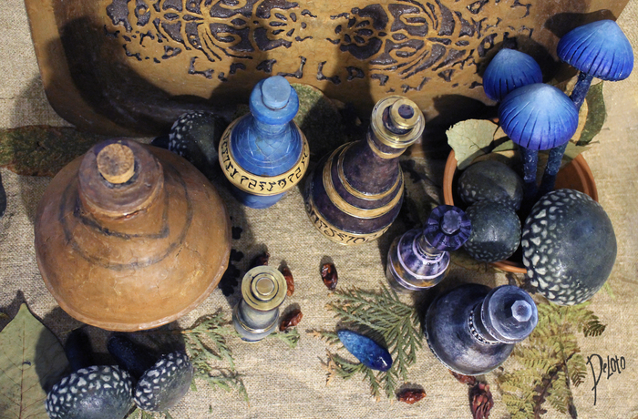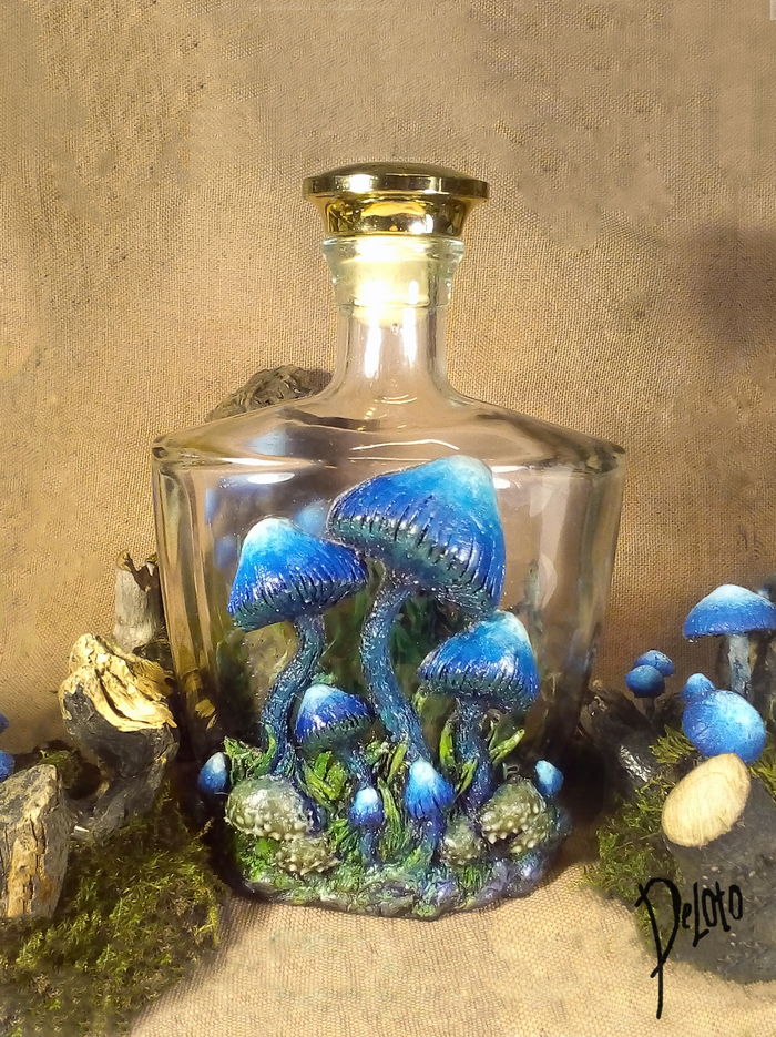 Бутылка с декором в виде лиловых копринусов и светящихся сыроежек. По мотивам TES III: Morrowind.