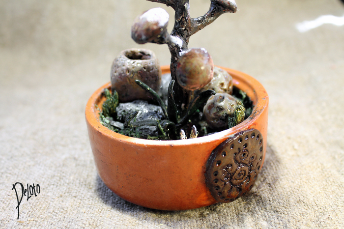 Материалы: стеклянная бутылка, полимерная глина, акрил, лак.